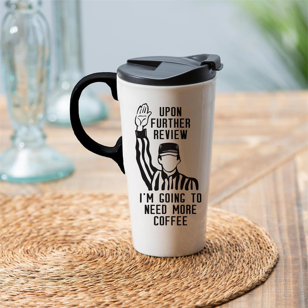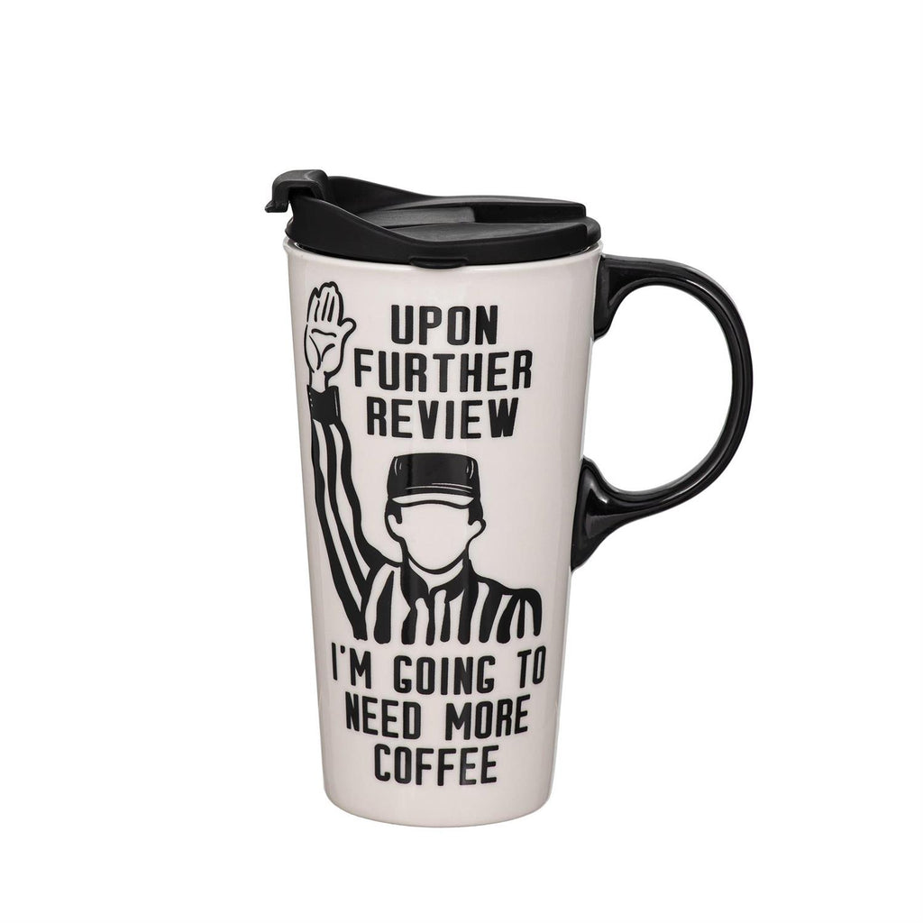 Too busy to sit down and enjoy a cup of coffee? No problem. This travel cup is ready for adventure. It features a cute saying that’s sure to make everyone laugh. Perfect for an on-the-go lifestyle, this travel cup is a top seller and fan favorite. Crafted from durable ceramic, the mug is covered in charming artwork and holds up to 17 ounces of any beverage. Its three-ring silicone lid fits perfectly into the cup's molded grooves for added security. For quick cleaning and reheating purposes, it's top-rack dishwasher safe and can be microwaved. The cup comes packaged in a beautiful coordinating gift box.