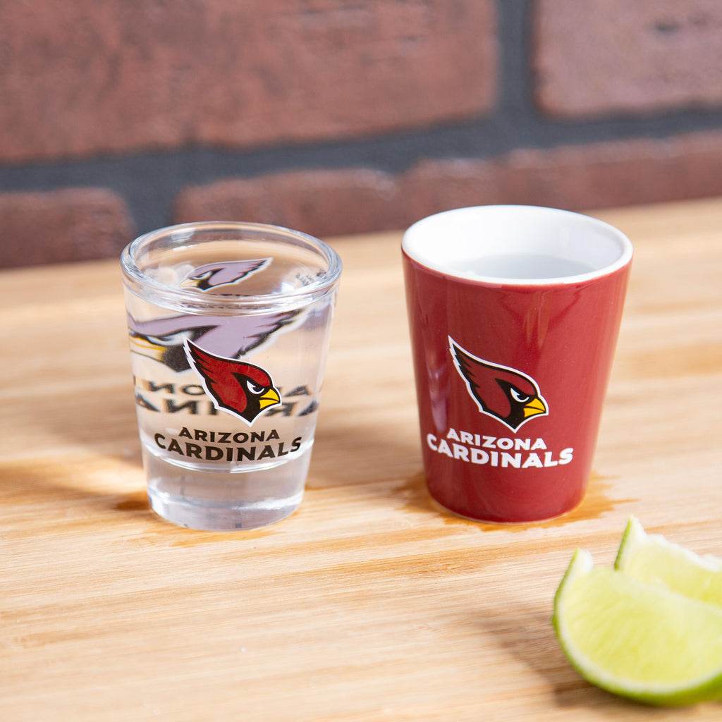 • Includes two ceramic and two glass shot glasses featuring the Arizona Cardinals logo.