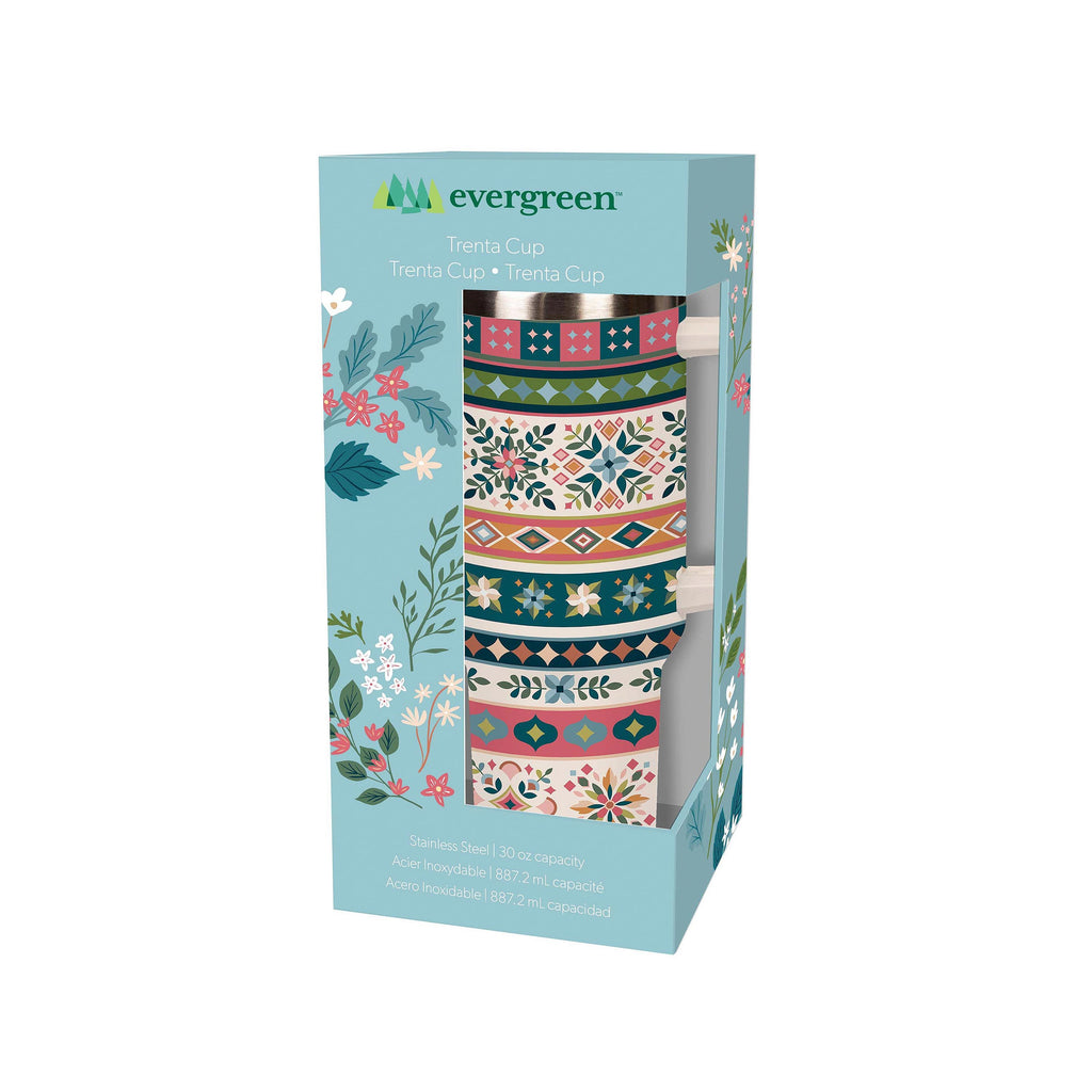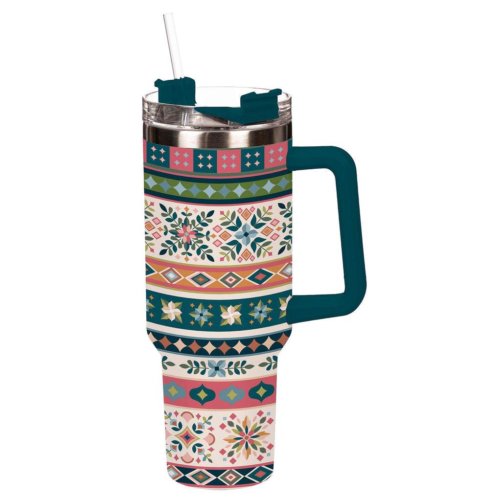 Enjoy your drinks in style with the Diamond Tapestry Tumbler, featuring a vibrant and intricate design. Perfect for keeping beverages hot or cold, this 30oz stainless-steel cup comes with a convenient straw and gift-ready packaging.