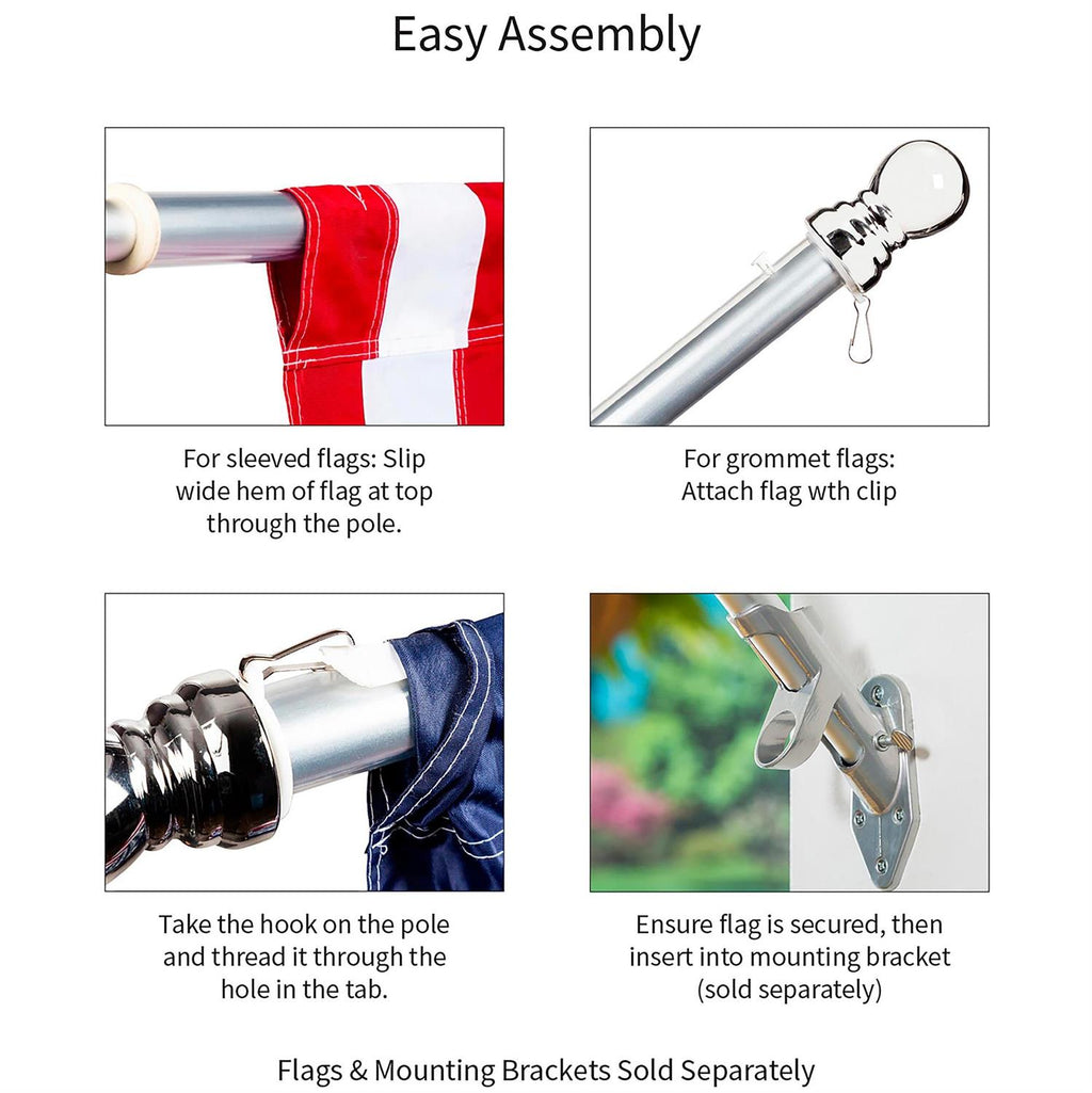 The Chrome Finish Aluminum Pole with Anti-Wrap Tube adds a touch of elegance to your flag display. This high quality aluminum construction ensures excellent quality for a long time. The classic chrome finish gives your flag pole a high end look. The anti-slip clips prevent the flag from being tangled and keeps the flag in place. It is easy to use and is compatible with most regular and deluxe sized flags and is weather resistant, making it the perfect outdoor accessory.