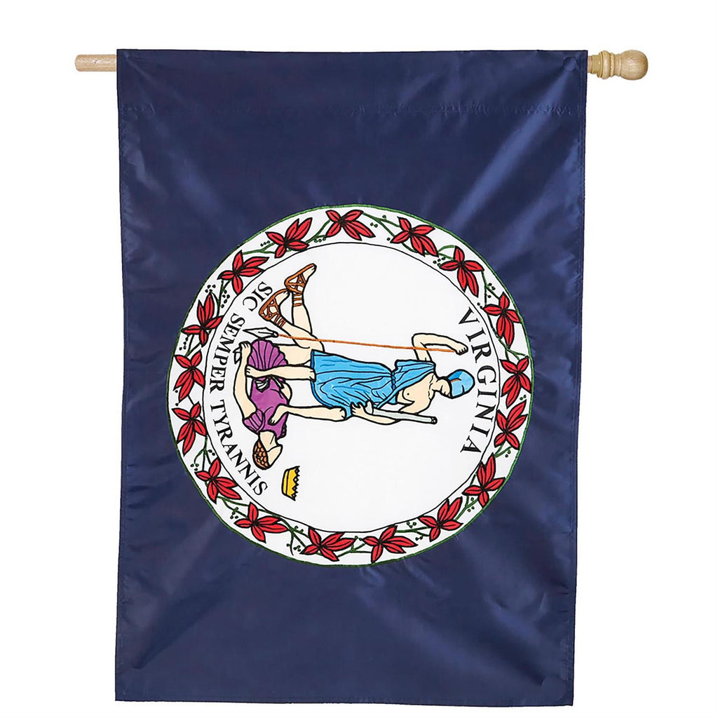 Upon a deep blue background, the Virginia seal is presented on this flag with Lady Virtue standing tall over a fallen tyrant. His displaced crown lies by the side, and bravery and independence are on display. The pride of being a Virginian will be shown off on this flag with every wave in the breeze. This applique flag is made of weather-resistant, 310 denier nylon to ensure the design will withstand all seasons. The applique process combines pieces of high-quality fabric with tight, detailed stitching to create a mosaic effect. The soft, yet heavy-weight material illuminates in the sunlight, making any of our applique flags a wonderful addition to your home or garden. All flags also feature an insertion sleeve at top for use with any standard flagpole or stand, sold separately.