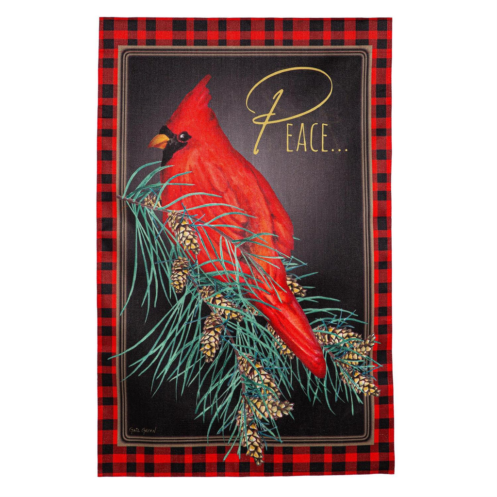 Decorate for the season and welcome friends and family to the home with this burlap house flag. It features a beautiful cardinal sitting on a branch with pinecones. A red plaid border and sweet “Peace” message add the final touches to this flag. Crafted of medium-weight, soft polyester burlap fabric, this flag has the look and feel of real burlap. Artwork is heat transferred onto both sides of the textured fabric to create a natural, crafted look. The poly-burlap is a durable and weatherproof material that will not fade or fray after continued use. All flags also feature a sleeve for use with any standard flagpole or stand, sold separately.