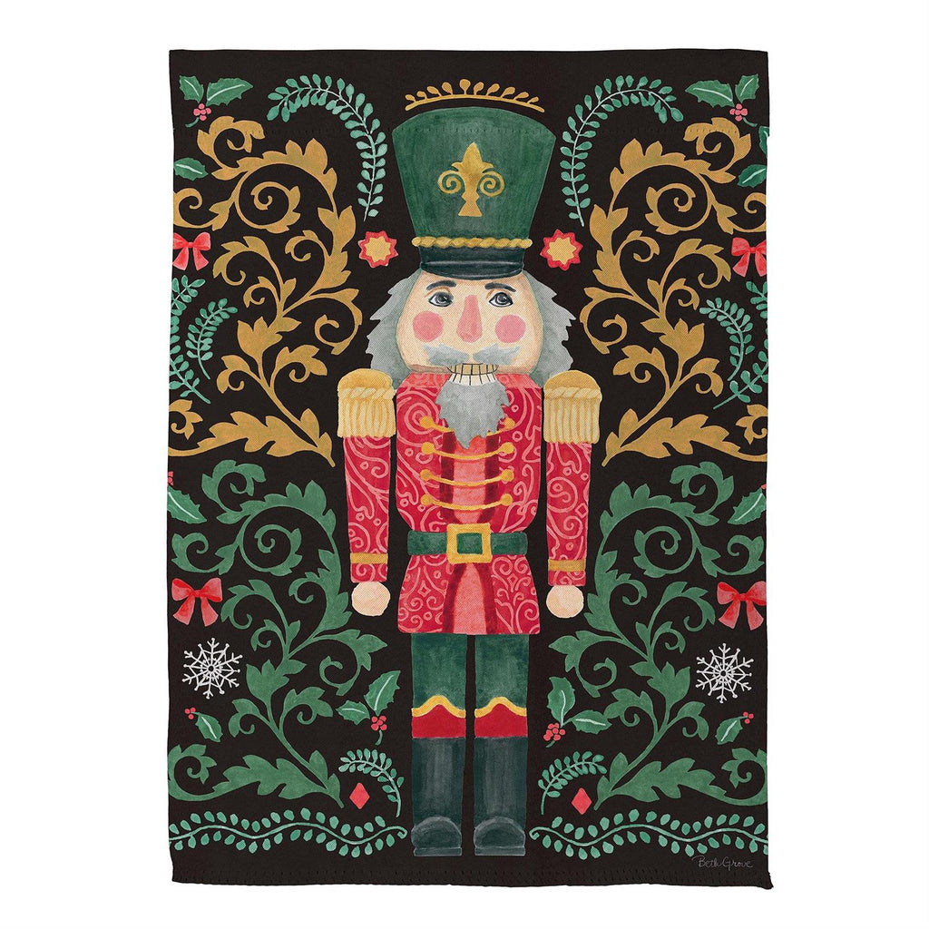 Celebrate the festive season with this Nutcracker & Sleigh Suede House Flag, a charming addition to your holiday décor. Measuring 29 inches in length and 43 inches in height, this flag is crafted from durable suede for a luxurious feel and long-lasting use. The vibrant design features a classic nutcracker and a beautifully detailed sleigh filled with gifts, set against a rich black background adorned with intricate floral patterns. Perfect for adding a touch of elegance to your garden or front porch, this flag brings the spirit of the holidays right to your doorstep.