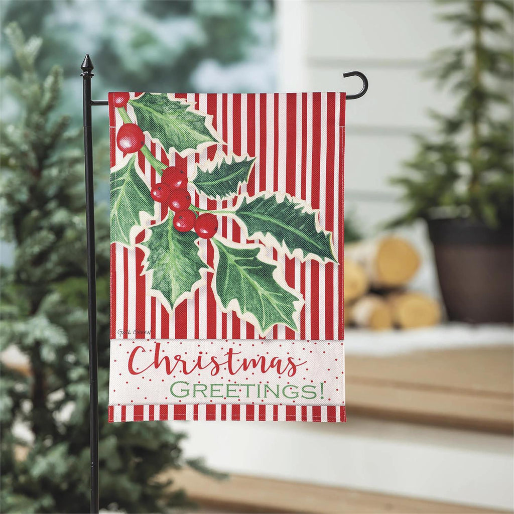 Decorate for the season and welcome friends and family to the home with this burlap garden flag. It features a holly and berry stem set against a red and white striped background for extra festive flair. Its “Christmas Greetings” message is sure to make guests smile. Crafted of medium-weight, soft polyester burlap fabric, this flag has the look and feel of real burlap. Artwork is heat transferred onto both sides of the textured fabric to create a natural, crafted look. The poly-burlap is a durable and weatherproof material that will not fade or fray after continued use. All flags also feature a sleeve for use with any standard flagpole or stand, sold separately.