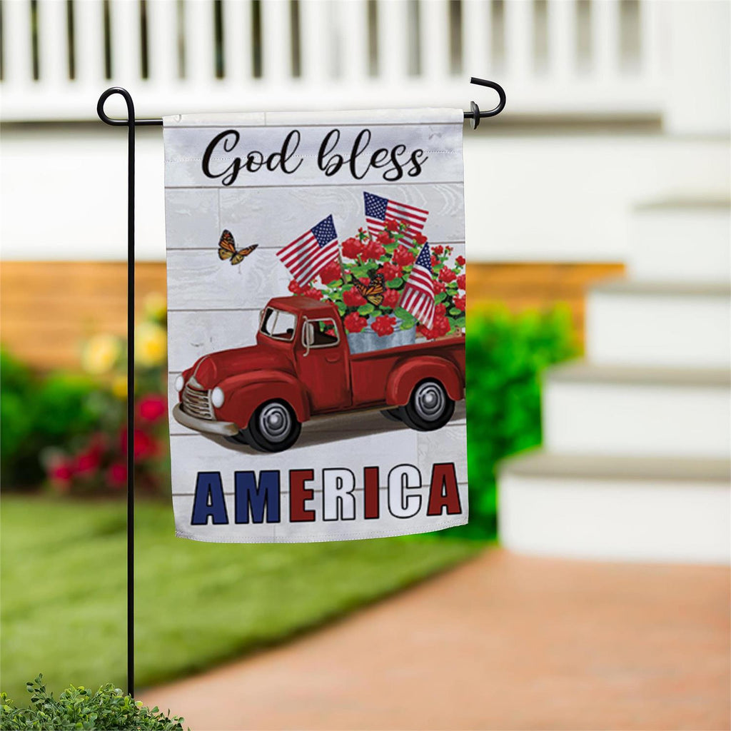 Celebrate your patriotic spirit with the Vintage Truck America Burlap Garden Flag. Crafted from durable burlap, this flag features a charming design of a red vintage truck adorned with American flags and bright flowers, set against a rustic wood-like background. Perfect for adding a touch of Americana to your garden or front yard, this flag measures 12.5 inches in length and 18 inches in height, fitting standard garden flag poles. Its vibrant colors and classic appeal make it ideal for holidays and everyday display, bringing a welcoming feel to any outdoor space.