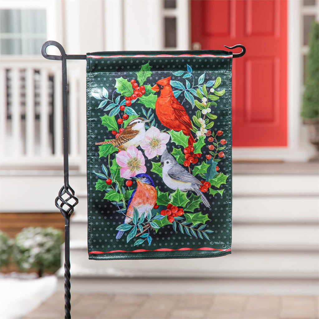 Bring joy to your world when you hang up this Winter Bird Friends Lustre Garden Flag. It features a darling design that's sure to brighten friends and loved one’s spirits. With the highest sheen on the market, our Lustre Flags shimmer in the sunlight to mesmerize everyone who sees them. Artwork is heat transferred onto both sides of the flag to guarantee the UV dyes are locked in. These two-sided designs use our sun-blocking technology to minimize fading and fraying, ensuring they remain vibrant and protected against the elements season after season.
