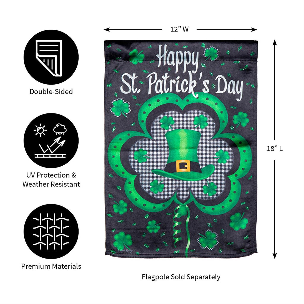 Celebrate St. Patrick's Day in festive style with this Welcome St. Pat's Lustre Garden Flag. Complete with bold shamrocks and a "Happy St. Patrick's Day" message, this flag is perfect for decorating any outdoor space. With the highest sheen on the market, our Lustre Flags shimmer in the sunlight to mesmerize everyone who sees them. Artwork is heat transferred onto both sides of the flag to guarantee the UV dyes are locked in. These two-sided designs use our sun-blocking technology to minimize fading and fraying, ensuring they remain vibrant and protected against the elements season after season.