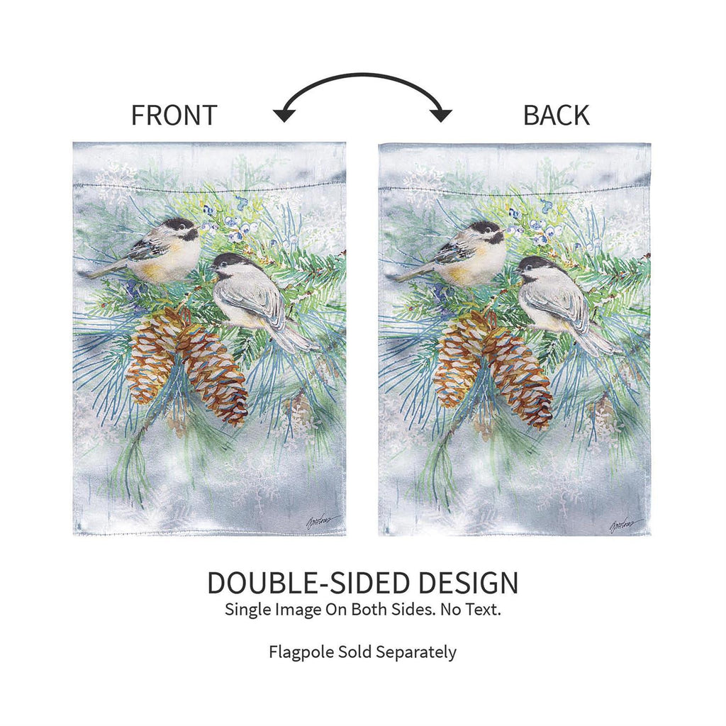 Decorate for the season and welcome friends and family to the home with this lustre garden flag. It features sweet, feathered friends sitting on snowy branches surrounded by pinecones and snowflakes. Made of premium satin polyester fabric, Evergreen’s Lustre flags have the highest sheen on the market. The UV-protected dyes are locked in by our heat-transferring process that guarantees artwork is protected from the elements season after season. Our sun-blocking technology is used on these two-sided designs to reduce fading and fraying, ensuring that they stay vibrant for years to come.