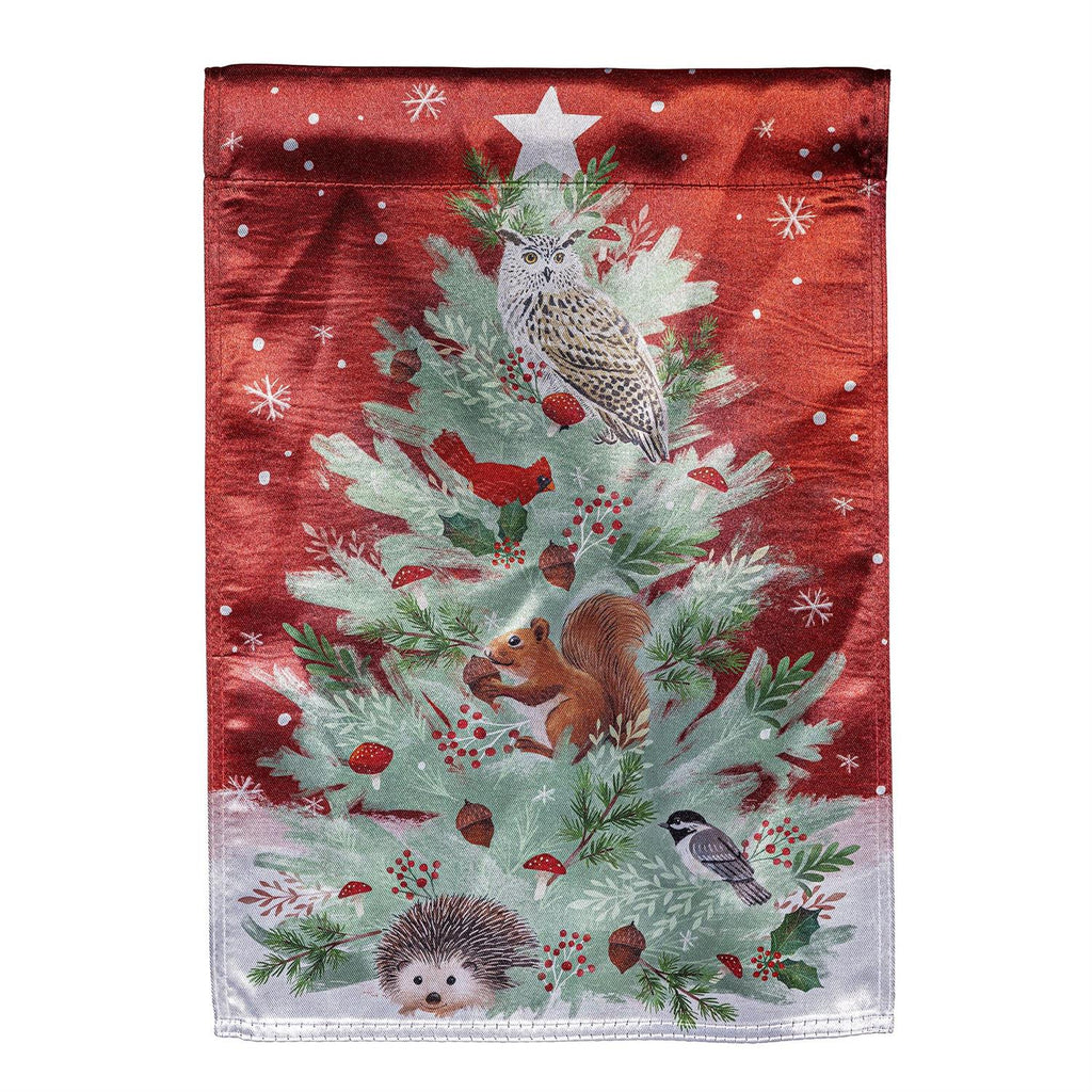 Celebrate the festive season with the Woodland Animal Christmas Tree Lustre Garden Flag. This charming flag features a detailed illustration of woodland creatures nestled among a Christmas tree, set against a rich red backdrop adorned with snowflakes. Perfect for adding a whimsical touch to your garden or yard, this flag is made from durable, lustrous fabric that ensures vibrant colors and long-lasting use. Measuring 12.5 x 18 inches, it's the ideal size to make a statement without overwhelming your outdoor décor. Welcome guests with this enchanting scene that captures the spirit of the holidays.