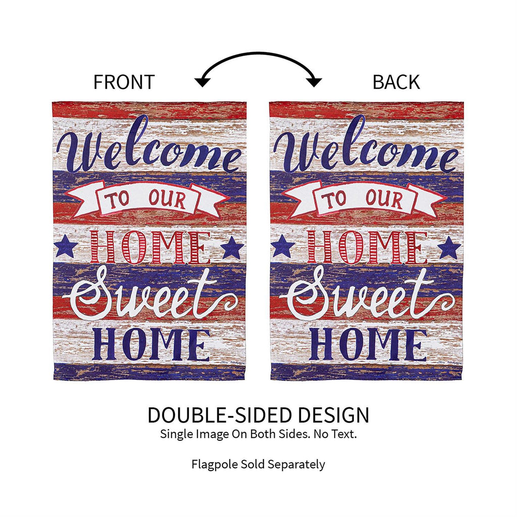 Bring patriotic flair to your garden with this Farmhouse Home Sweet Home Garden Suede Flag! Display the red, white and blue design with pride as it welcomes guests and neighbors in patriotic style. The distressed look gives this flag a rustic feel that adds to its charming homespun appeal. This Suede Reflections flag is made of medium-weight, polyester suede that provides a soft and durable texture. Artwork is heat transferred onto the sun-blocking material so that it is easily viewed from both sides. The weatherproof poly-suede will not fray or fade with continued outdoor use. This flag features a sleeve for use with any standard flagpole or stand, sold separately.