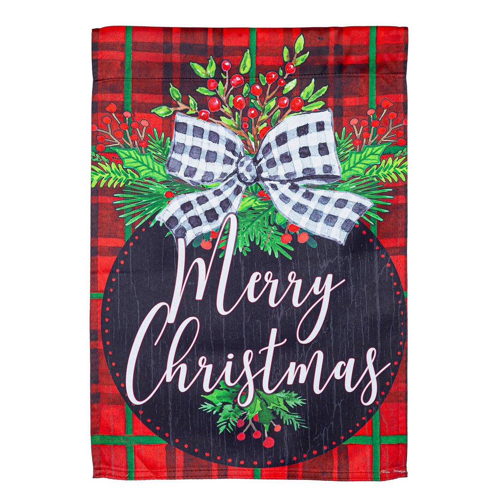 Greet family and loved ones this holiday season with this Farmhouse Ornament Suede Garden Flag. Featuring a beautiful bow and mistletoe, this flag will make sure everyone knows what holiday is being celebrated. Bright colors and a unique design ensure this flag will be the center of attention. Artwork is heat transferred onto the sun-blocking material so that it is easily viewed from both sides. The weatherproof poly-suede will not fray or fade with continued outdoor use. This flag features a sleeve for use with any standard flagpole or stand, sold separately.