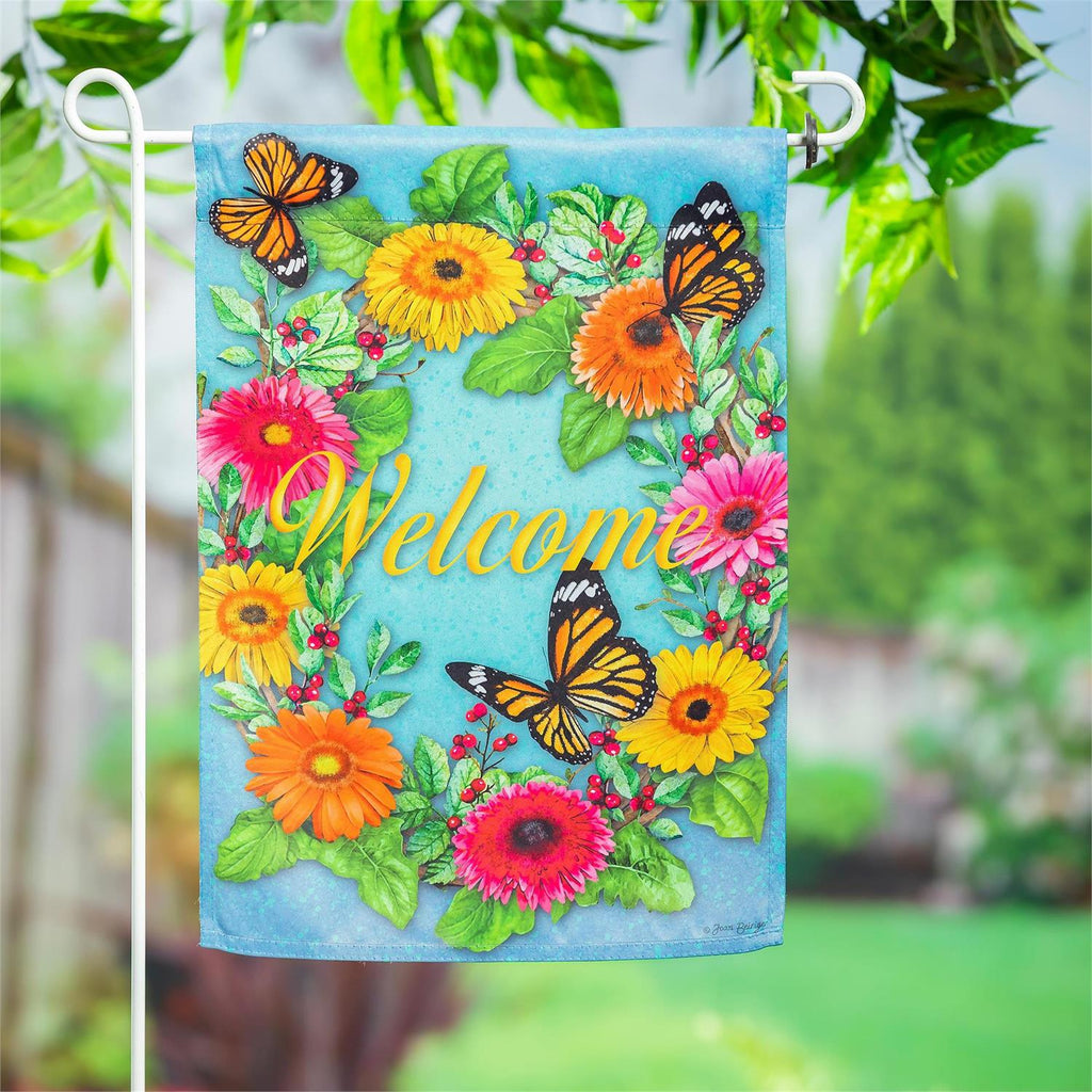 This Gerbera Butterflies Suede Garden Flag brings a beautiful statement to any garden. This Suede Reflections flag is made of medium-weight, polyester suede that provides a soft and durable texture. Artwork is heat transferred onto the sun-blocking material so that it is easily viewed from both sides. The weatherproof poly-suede will not fray or fade with continued outdoor use. This flag features a sleeve for use with any standard flagpole or stand, sold separately.