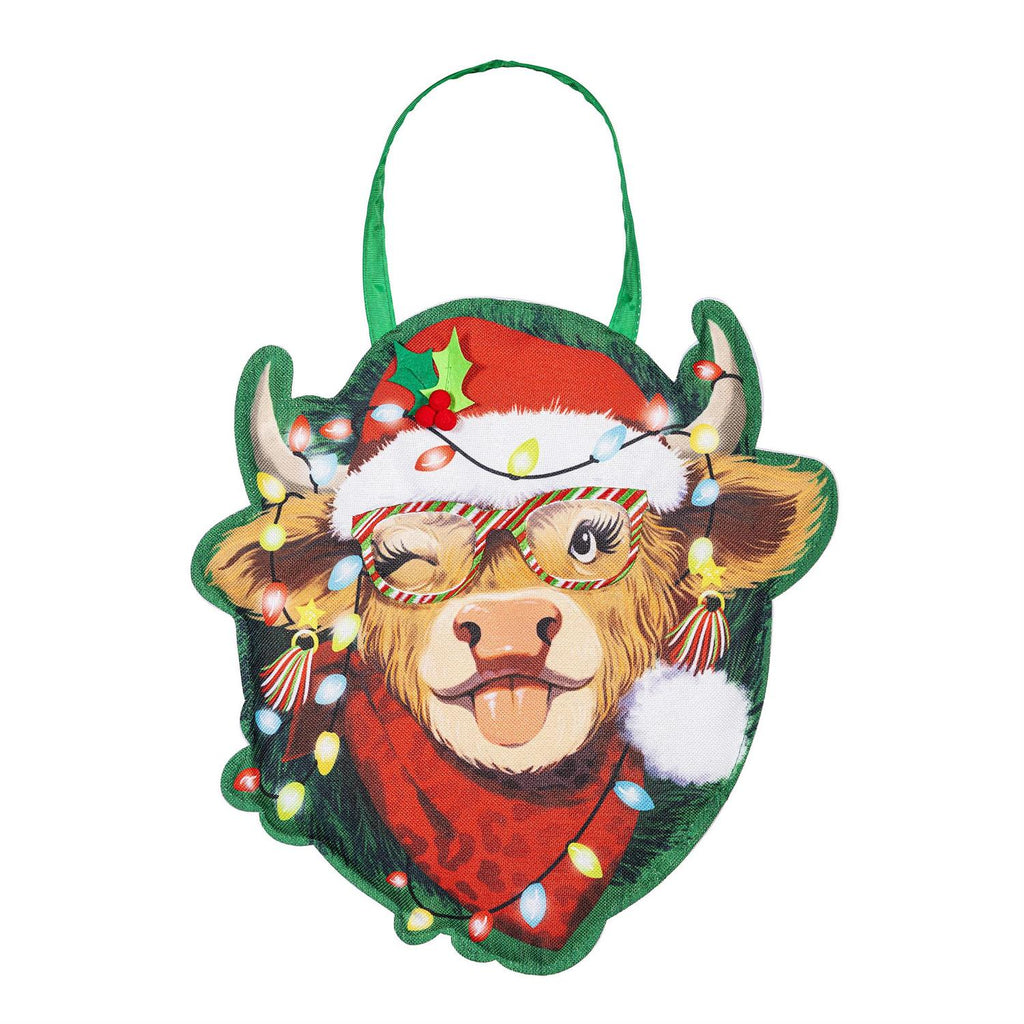 Add a whimsical touch to your holiday décor with the Merry Highland Ho Door Décor. Measuring 13.5 inches in length, 1.25 inches in width, and 19 inches in height, this festive piece features a playful Highland cow adorned with a Santa hat and Christmas lights. Crafted for seasonal charm, it's perfect for welcoming guests with a smile. The colorful design and durable materials make it suitable for both indoor and outdoor use, ensuring your door stands out this holiday season. Effortlessly hang it on your door to spread cheer and joy all around.