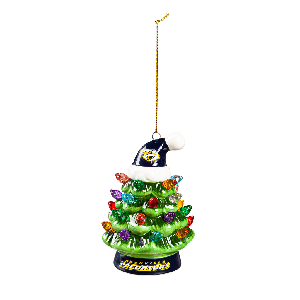 Celebrate the holiday season with this charming 4" LED ceramic Christmas tree ornament, featuring a Nashville Predators team Santa hat. Perfect for fans who want to showcase their team spirit, this ornament brings a festive touch to any Christmas tree. The vibrant LED lights illuminate the ceramic tree, creating a warm and cheerful ambiance. Compact and easy to hang, it's an ideal addition to your holiday décor, ensuring your team pride shines bright all season long.