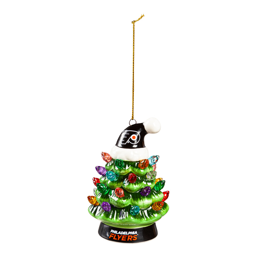 Celebrate the holidays with this charming 4" LED ceramic Christmas tree ornament, adorned with a Philadelphia Flyers Team Santa Hat. Perfect for any Flyers fan, this ornament adds a festive touch to your holiday décor. Its colorful LED lights illuminate, creating a warm and cheerful glow. Crafted from durable ceramic, this ornament is sure to be a treasured keepsake for years to come. Measuring 2.6" in length, 2.55" in width, and 3.82" in height, it fits perfectly on any Christmas tree, mantel, or shelf.