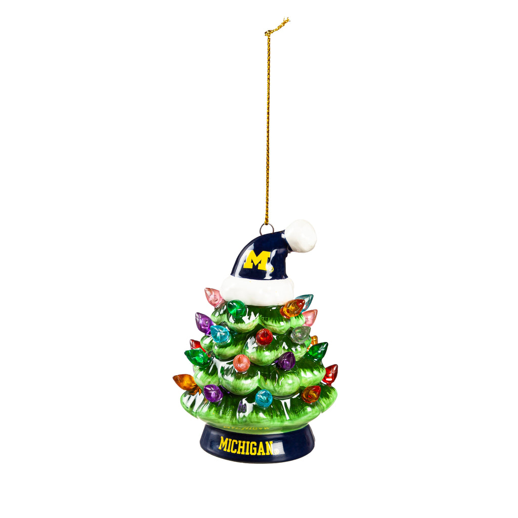 Celebrate the holiday season and show off your school spirit with this charming 4" LED Ceramic Christmas Tree Ornament. Featuring a festive Team Santa Hat adorned with the University of Michigan's iconic colors, this ornament is perfect for any fan or alumni. Crafted from durable ceramic, it lights up with colorful LED bulbs, adding a warm glow to your holiday décor. Measuring 2.55" in length, 2.6" in width, and 3.82" in height, it's a perfect fit for your tree or as a standalone decoration. Make your Christmas merry and bright with this unique ornament.