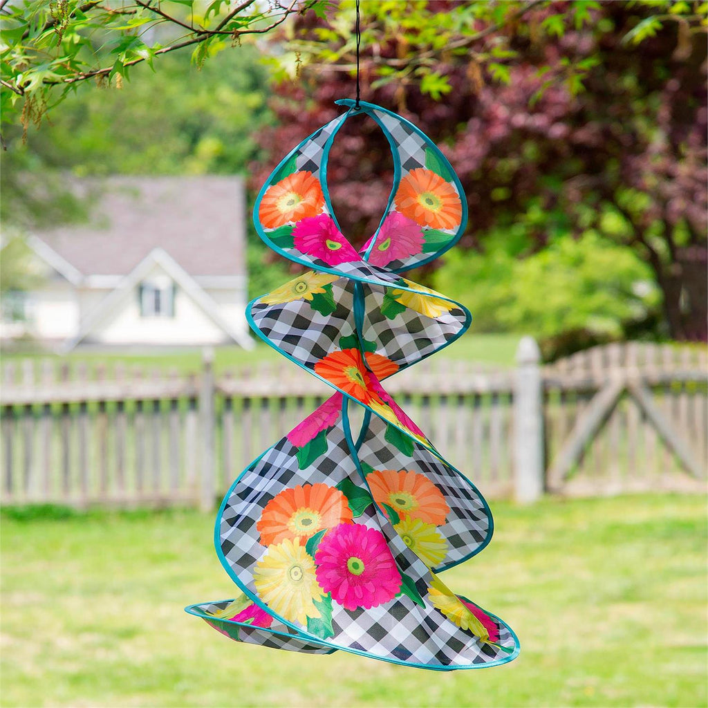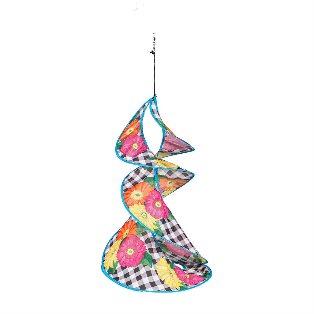 Spin your way into spring with this Gerbera Daisy Trio Twister. This lively design features gerbera daisies making a colorful statement against a black and white plaid background. Our wind twisters collection combines the concept and functionality of our windsocks and wind twirlers. Watch as the designs twists and rotates in a way that will catch the eye of every passerby. Crafted from a poly material similar to our balloon spinners, this design is safe for outdoor use and is long-lasting. Boning built into the twister maintains the spiral shape and keeps the body continually moving. Each design utilizes the same hanger as our wind spinners with a metal swivel to prevent tangling.