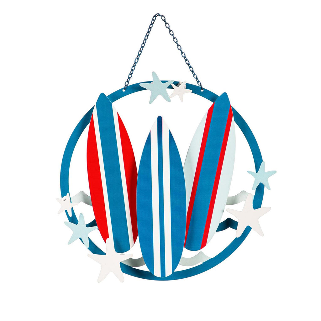 Enhance your outdoor space with this laser cut metal coastal hanging garden décor. Featuring a vibrant nautical theme, this piece brings a touch of the seaside to your wall. Measuring 10 inches in length and 13.13 inches in height, it fits perfectly in any patio or garden setup. The intricate design showcases surfboards and anchors surrounded by starfish and shells, creating a playful yet elegant look. Durable and weather-resistant, this décor is perfect for year-round use, adding charm and personality to your exterior walls.