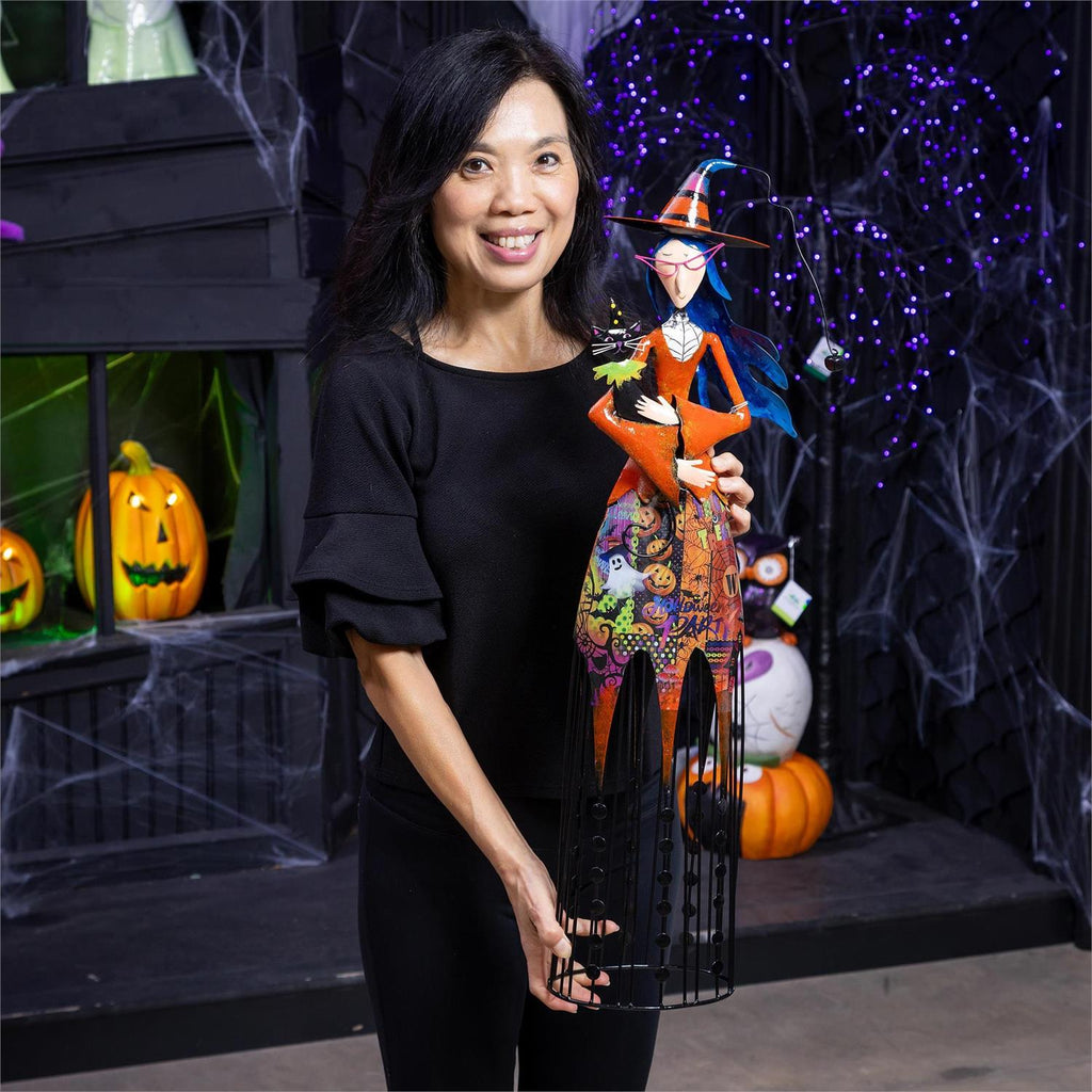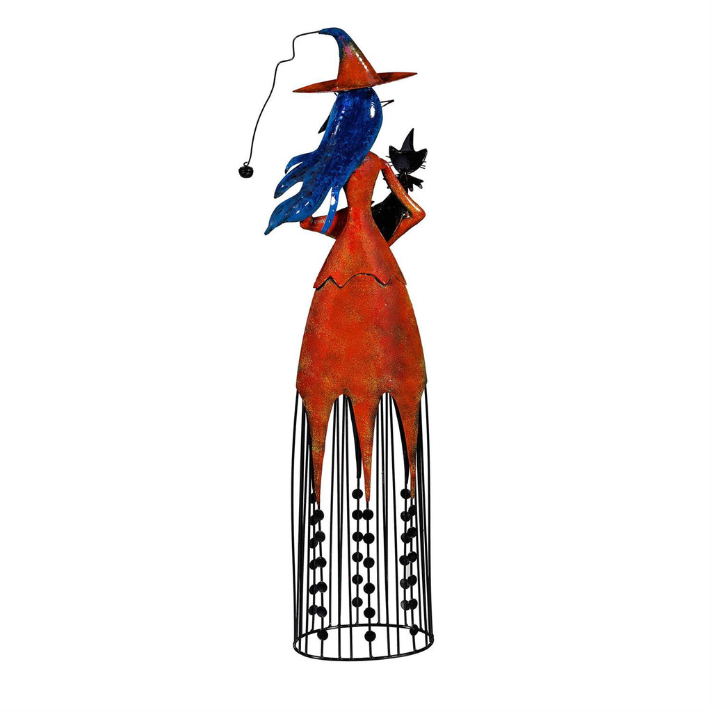 Enhance your outdoor space with this whimsical Witch Metal Statue, standing a striking 30.5 inches tall. Perfect for the autumn season, this garden statue captures the playful spirit of Halloween with its vibrant colors and charming details. Crafted from durable metal, it showcases a witch holding her trusty black cat, bringing a touch of enchantment to your garden or patio. The intricate design features a colorful dress adorned with classic Halloween motifs, making it a delightful focal point for any outdoor décor. Whether placed on your porch or amongst your garden plants, this statue is sure to delight guests and passersby alike.