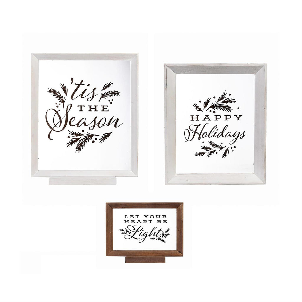 Celebrate the festive season with this charming set of three wood framed holiday décor pieces. Featuring cheerful messages like "Happy Holidays," "Let Your Heart Be Light," and "'Tis the Season," these signs add warmth and joy to any interior. Each piece measures 9.0 inches in length and 12.0 inches in width, perfect for adorning your living room, hallway, or dining area. The sturdy wood frames, combined with their elegant design, make them a timeless addition to your seasonal decorations. Embrace the spirit of the holidays and create a welcoming atmosphere with these delightful wall accents.