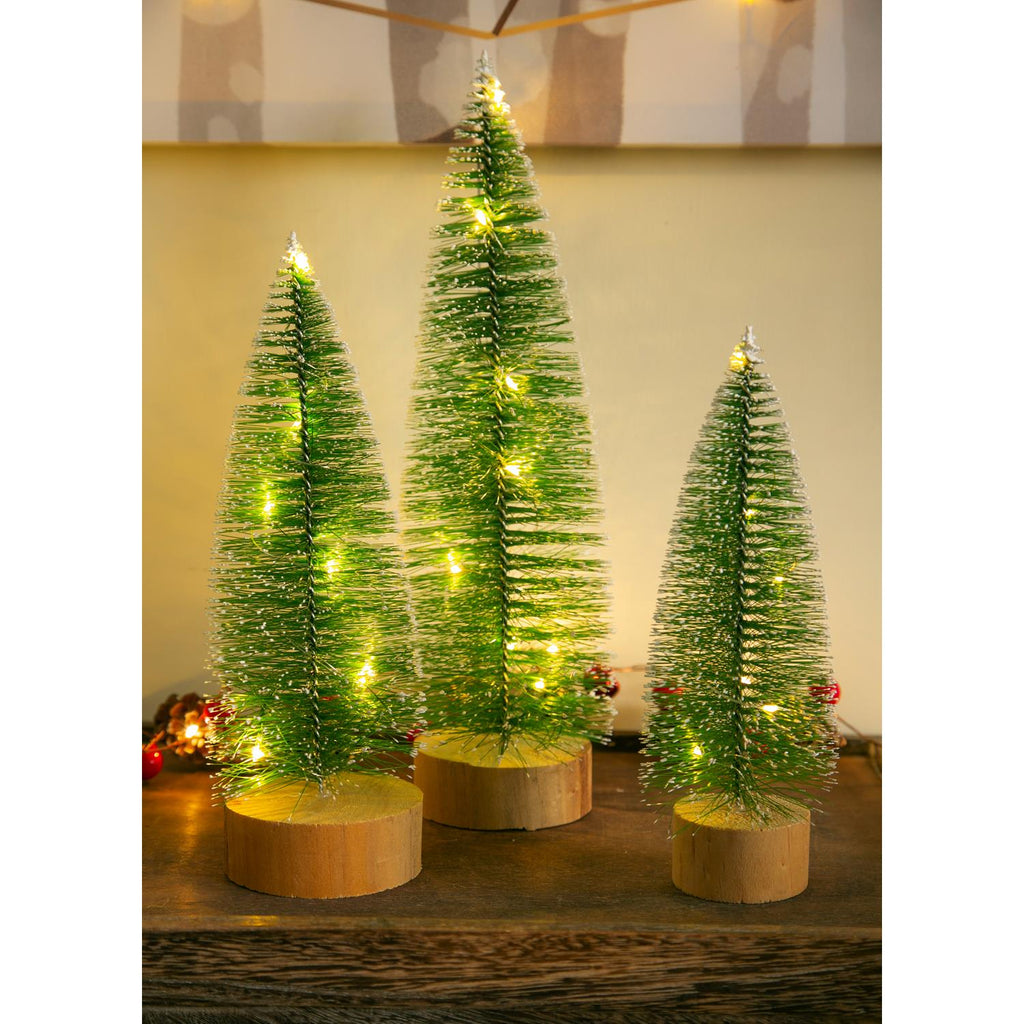 Enhance your holiday décor with this charming set of LED Bottlebrush Trees. Each tree stands at 10.8 inches tall, featuring a lush green color with white-tipped branches that mimic freshly fallen snow. Illuminated by warm LED lights, these trees create a cozy and festive ambiance for any table setting. Their compact size and wooden bases make them versatile for various spaces, from mantelpieces to dining tables. Perfect for adding a touch of winter wonderland to your home, these trees are a delightful seasonal addition.