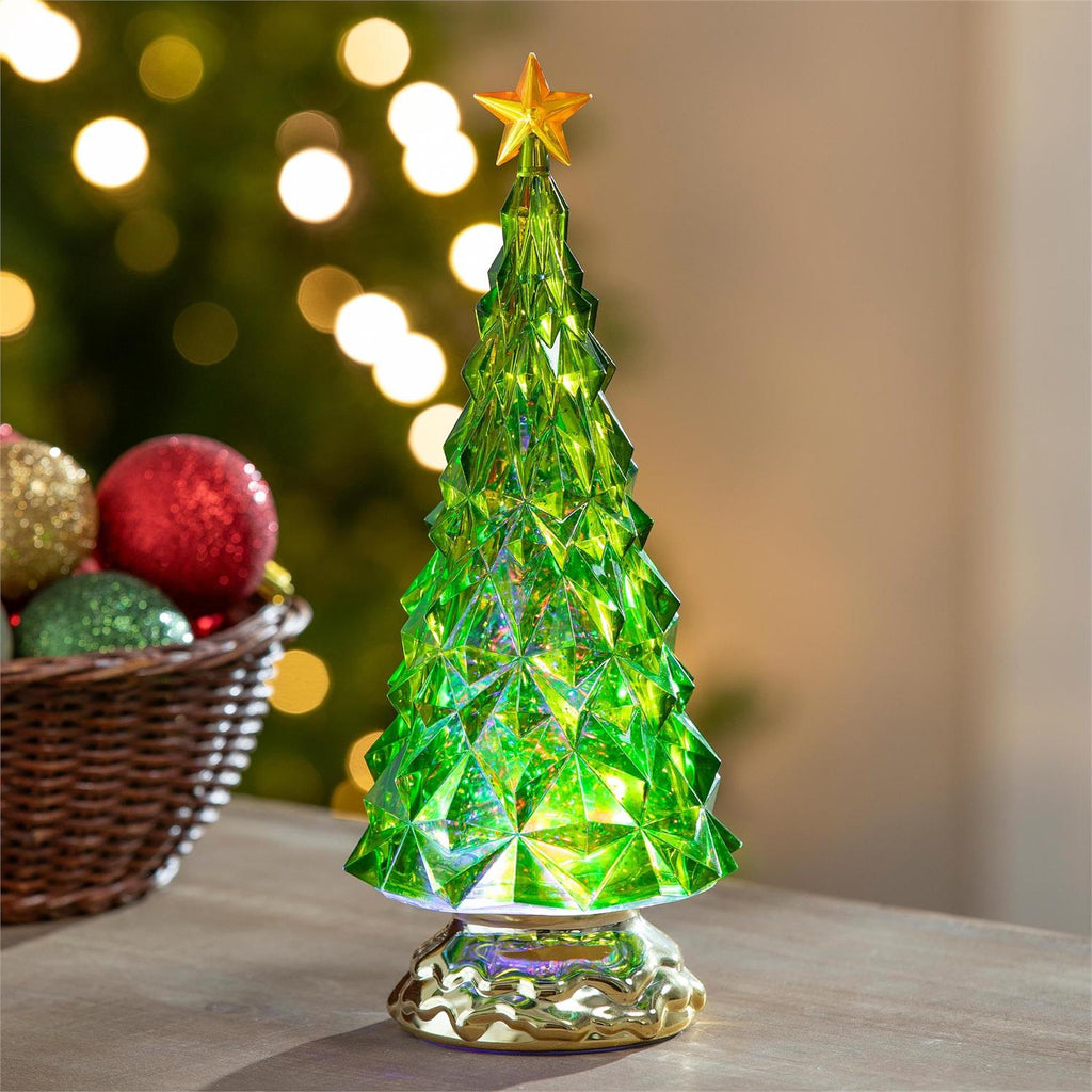 Illuminate your holiday décor with this stunning 11.5" LED Color Changing Tree with Star Water Lantern. Measuring 5" x 5" x 11.5", this enchanting piece features a vibrant green tree with a sparkling star on top. Perfect for creating a festive ambiance, the lantern's LED lights transition through a spectrum of colors, adding a magical touch to any room. Ideal for mantels, tabletops, or as a centerpiece, this water globe is designed to captivate and charm all who see it.