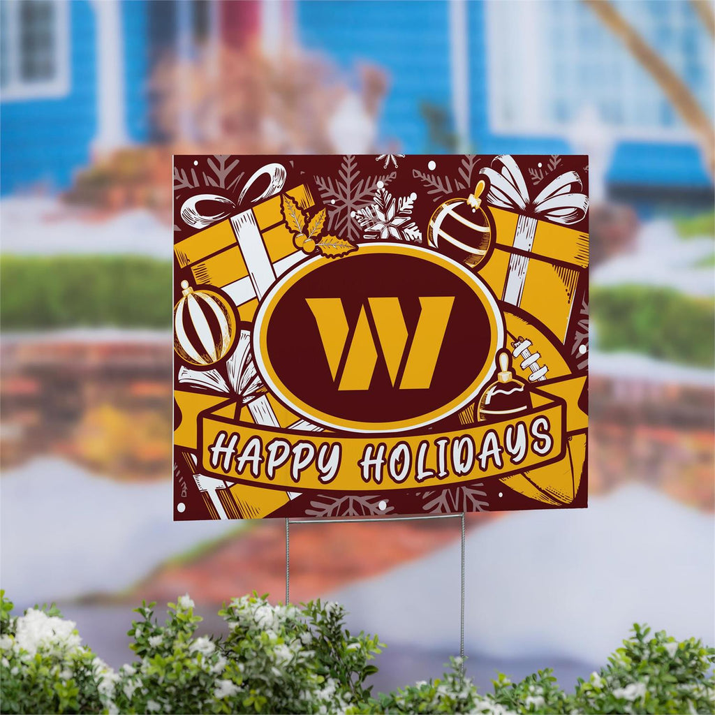 Celebrate the holiday season with this vibrant Washington Commanders yard sign. Measuring 24 by 18 inches, this sign is perfect for fans looking to add festive flair to their outdoor décor. Its durable construction ensures it withstands the elements, while the bright colors and cheerful design make it a standout piece for any lawn or garden. Easy to install, this sign features a sturdy metal stake, making it both practical and stylish. Show your team spirit and holiday cheer in one beautiful display.