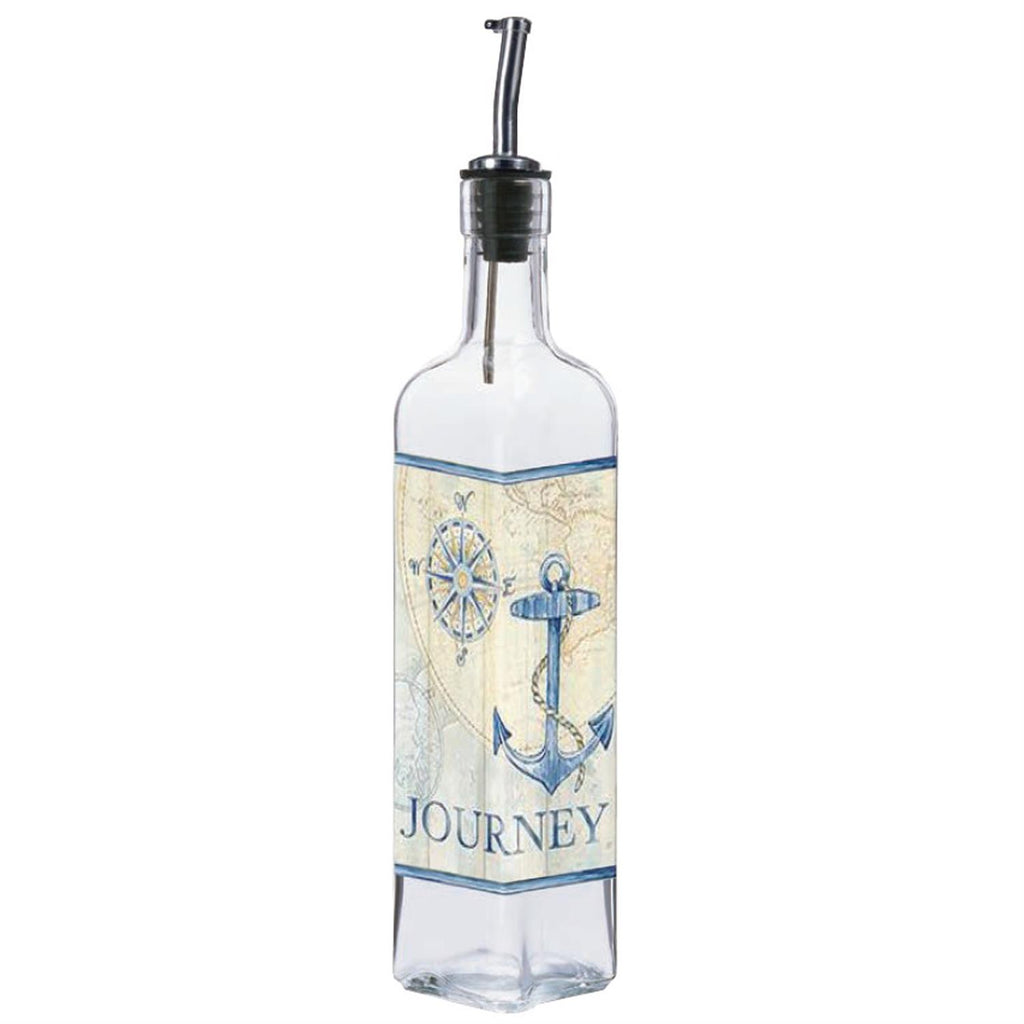 Add a nautical touch to your kitchen with the Journey Glass Oil Bottle. Perfect for storing and dispensing your favorite oils, this bottle features a charming maritime design with an anchor and compass motif. Its clear glass construction allows you to easily monitor contents, while the stainless steel pour spout ensures precise pouring. Measuring 2.5 inches in length, width, and 12.5 inches in height, it's both functional and stylish, fitting seamlessly on countertops or in cabinets. Ideal for everyday use or as a decorative piece, this bottle combines practicality with a touch of adventure.