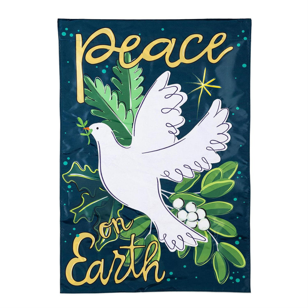 Welcome serenity into your home with the Peace On Earth Applique House Flag. Measuring 28 inches in width and 44 inches in height, this flag is perfect for seasonal decoration. Made with vibrant colors and detailed applique work, it features a serene dove and lush greenery, symbolizing peace and harmony. Ideal for outdoor display, it adds a touch of elegance and tranquility to any garden or entryway. Crafted for durability, this flag will withstand the elements while maintaining its beauty.