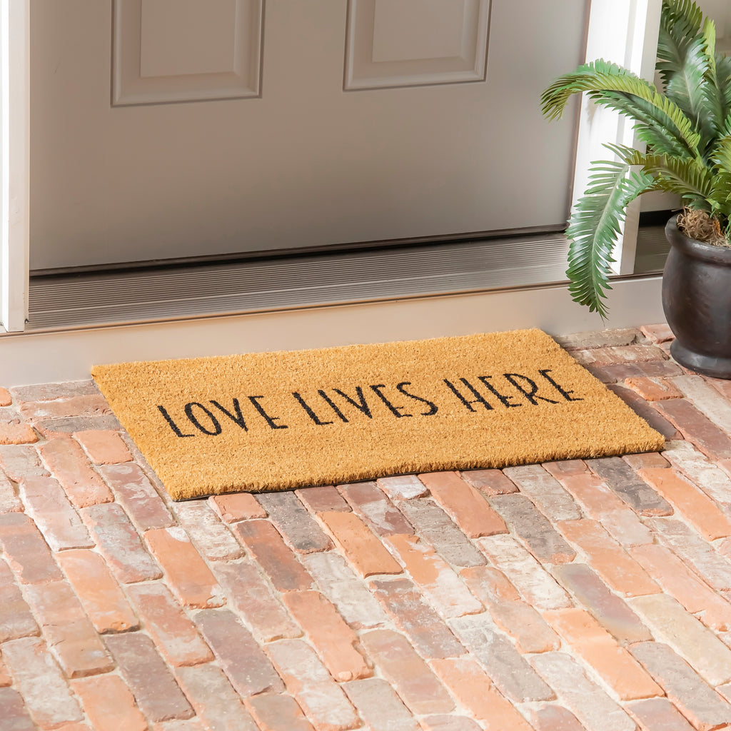 Welcome guests with warmth and style using the 'Love Lives Here' coir mat. Made from durable, natural coir fibers, this mat is designed to withstand heavy foot traffic while effectively trapping dirt and moisture. Its inviting message adds a personal touch to any doorstep, making it perfect for creating a welcoming atmosphere. Measuring 28 inches in length and 16 inches in height, this mat provides ample coverage for most entryways. Easy to clean, it's an ideal choice for busy households.
