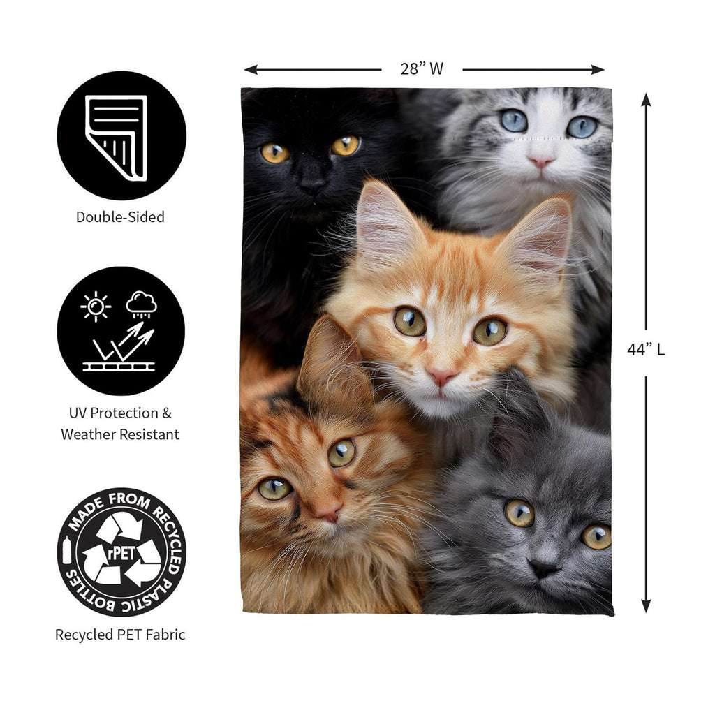 Transform your home's exterior with the charming CATS! Suede House Flag. Featuring an adorable cluster of curious cats, this flag is the perfect addition to any cat lover's decor. Measuring 43 inches in length and 29 inches in width, it is crafted from durable suede material that is both UV protected and weather resistant, ensuring vibrant colors season after season. Its double-sided design means you can enjoy the playful feline faces from any angle. Made from recycled PET fabric, this eco-friendly flag offers a sustainable way to showcase your love for cats while enhancing your garden or porch.