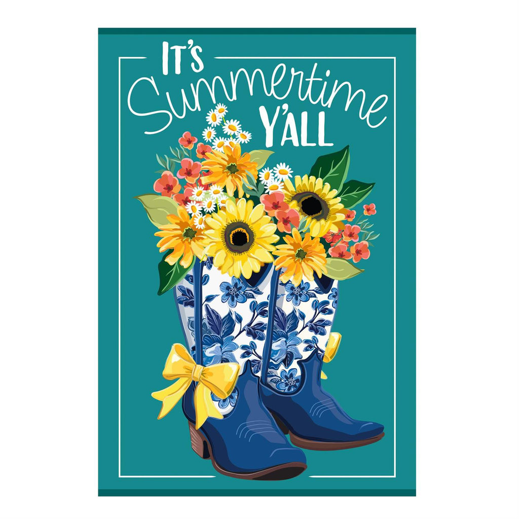 Celebrate the sunny season with the Chinoiserie Cowboy Boots & Bows Applique House Flag. Measuring 44 by 28 inches, this vibrant flag features an intricate design of cowboy boots adorned with floral patterns and cheerful bows. The bold colors and elegant applique create a striking visual, making it an ideal addition to your garden or porch for summer. Perfect for those who love a touch of Western charm with a chic twist, this flag will welcome guests with a warm and stylish message. Made with quality materials, it's designed to withstand the elements while keeping its vivid appearance.