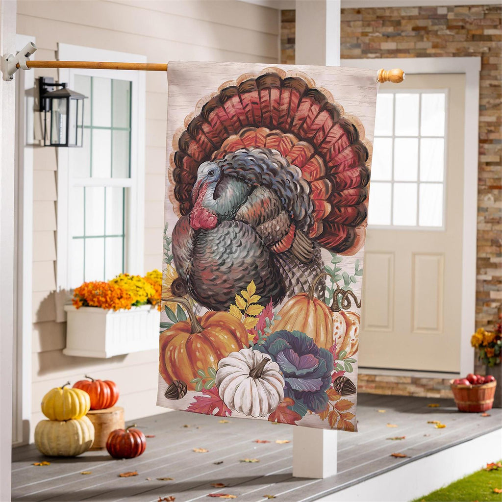 Celebrate the season with this Elaborate Turkey Applique House Flag. Perfect for adding a festive touch to your home, this flag showcases a beautifully detailed turkey surrounded by vibrant fall foliage and pumpkins. Crafted with high-quality applique techniques, the rich colors and intricate design make it a standout decoration for any outdoor space. Measuring 28.0 inches in width and 44.0 inches in height, this flag is an ideal size to display on your porch or garden. Welcome guests with the warmth of autumn and the spirit of Thanksgiving.