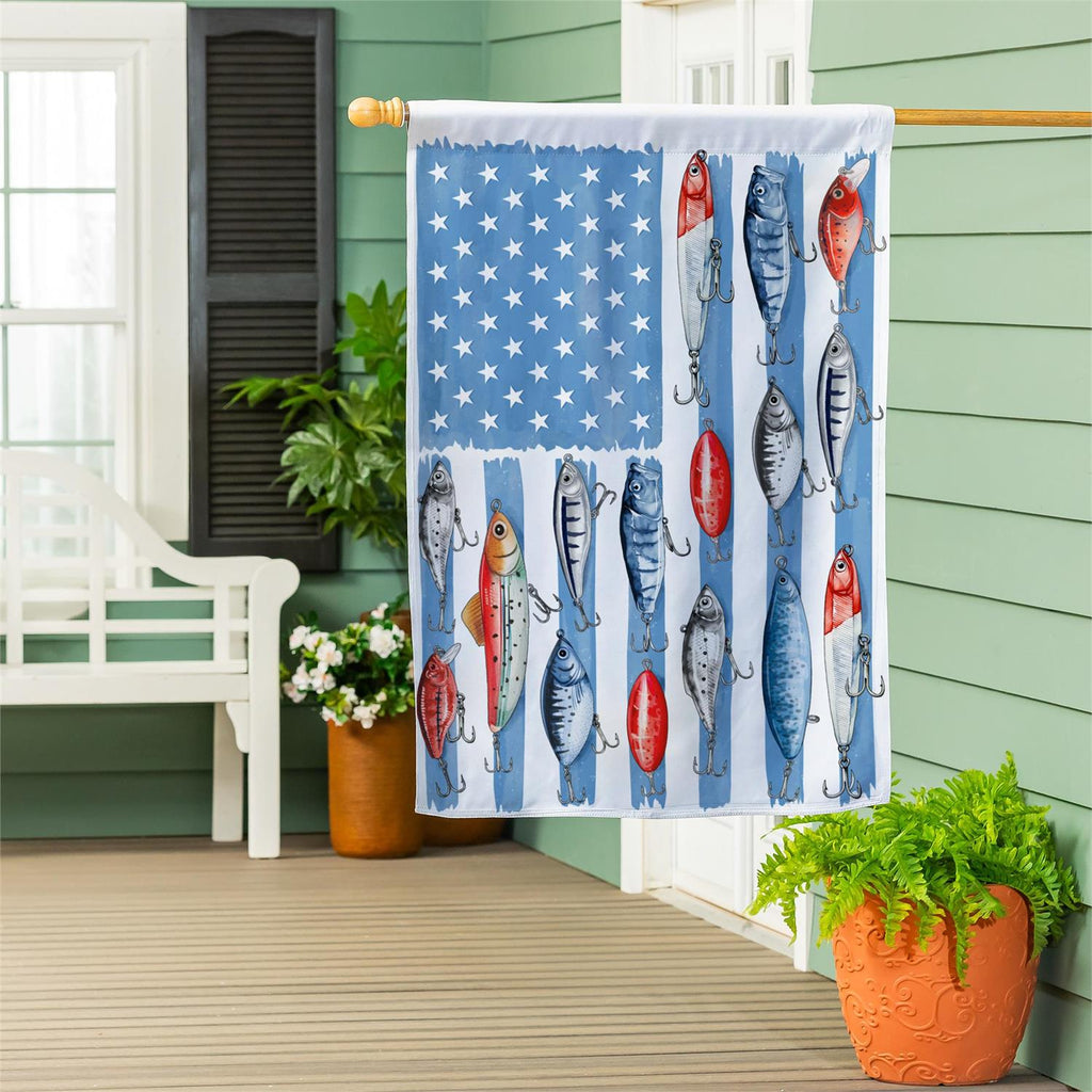 Celebrate your love for fishing and country with this Fishing Life Suede House Flag. Crafted from durable suede fabric, this vibrant flag features an eye-catching design of fishing lures against a backdrop reminiscent of the American flag. Perfect for adding a splash of color to your home or garden, this flag measures 43 inches in length and 29 inches in width, making it an ideal statement piece for any outdoor space. Its weather-resistant material ensures it will withstand the elements, providing enjoyment throughout the seasons. Ideal for fishing enthusiasts and patriotic homeowners alike.