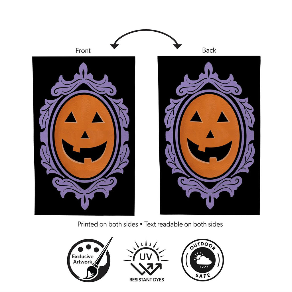 Elevate your Halloween decor with the Haunted House Pumpkin Moire Flag. Measuring 28 inches in width and 44 inches in height, this striking flag features a classic jack-o'-lantern design framed in an ornate purple border, set against a deep black background. Its moire pattern adds a unique visual texture, making it a standout piece for your porch or garden. Made for the fall season, this flag is perfect for adding a festive touch to your home while welcoming trick-or-treaters with a spooky charm.