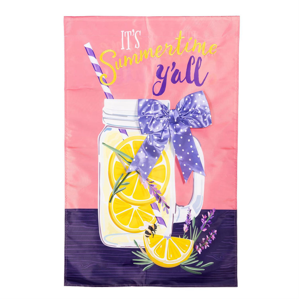 Welcome the warmth of summer to your home with the Lavender Lemonade Applique House Flag. This vibrant flag features a refreshing lemonade design, complete with bright lemons and fragrant lavender sprigs, all wrapped with a charming polka dot bow. The cheerful message 'It's Summertime Y'all' adds a touch of Southern hospitality to your garden or porch. Made of durable fabric, this applique flag is designed to withstand the elements, ensuring your summer spirit remains bright all season long. Perfect for outdoor gatherings, it brings a festive and inviting atmosphere to any home.