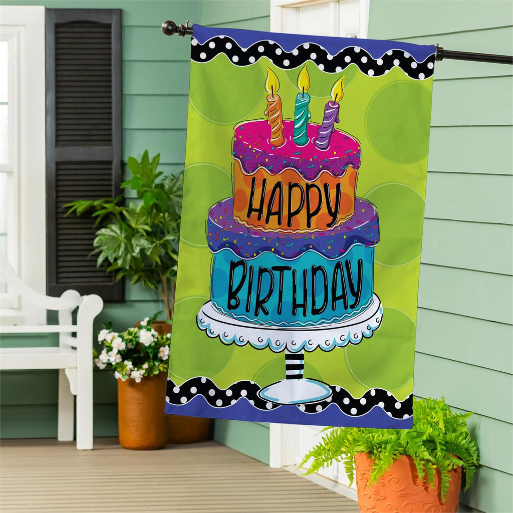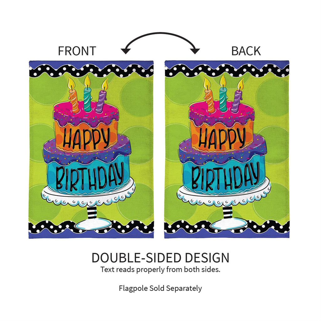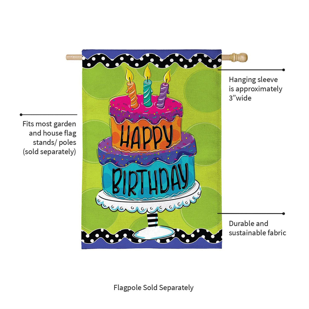 Celebrate birthdays with a splash of color using the Ric Rac Happy Birthday Cake Burlap House Flag. Measuring 44 x 28 inches, this vibrant flag features a playful birthday cake design with colorful candles and a polka dot border, making it the perfect addition to your outdoor decor. Crafted from durable burlap, it is designed to withstand various weather conditions while maintaining its vivid colors. Whether you're hosting a party or just want to spread some birthday cheer, this flag is sure to delight guests and neighbors alike.