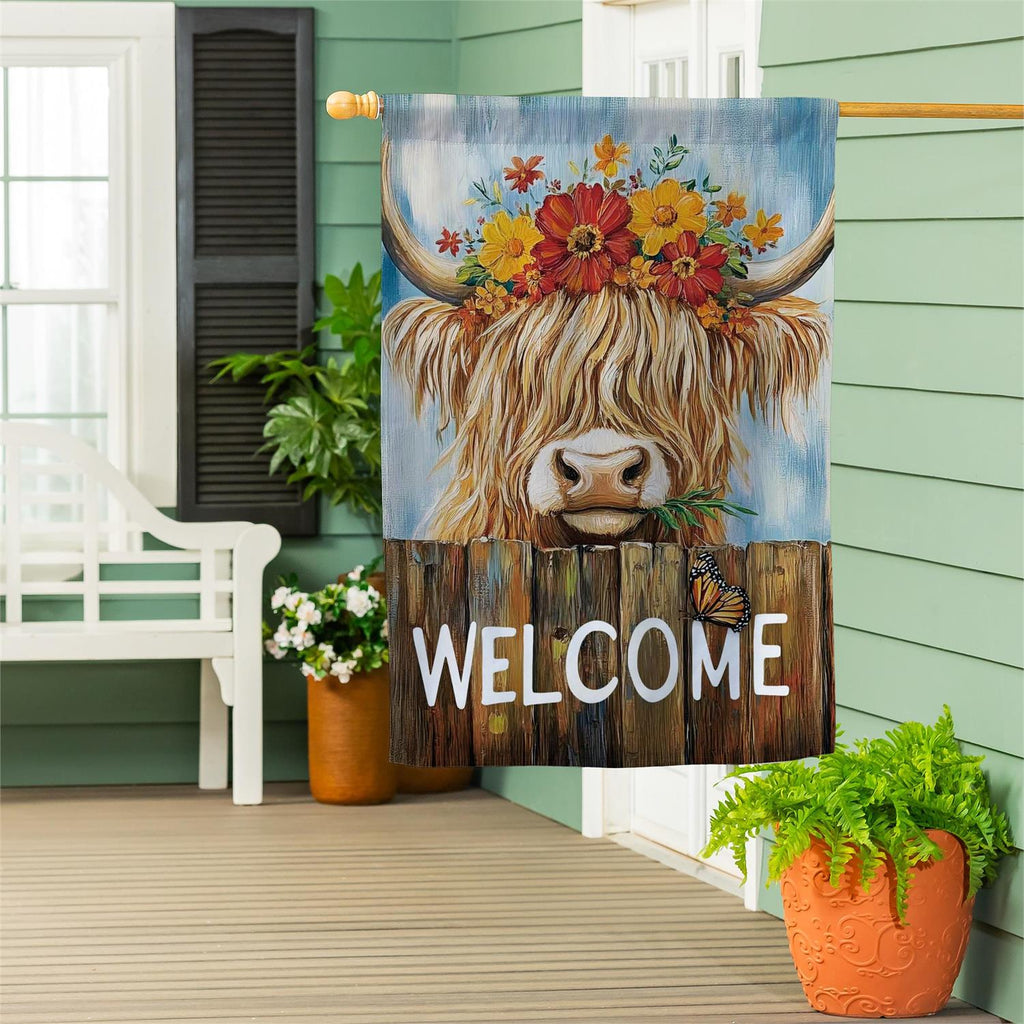 Welcome guests with the charming Summer Highland Cow Suede House Flag. This delightful flag features a whimsical highland cow adorned with a vibrant floral crown, set against a rustic wooden backdrop. Measuring 43 inches in length and 29 inches in width, it’s crafted from durable suede material to withstand the elements while maintaining its vivid colors. Perfect for adding a touch of rustic charm to your home’s exterior, this flag is ideal for summer and spring displays. The addition of a butterfly detail adds an extra element of nature-inspired beauty.
