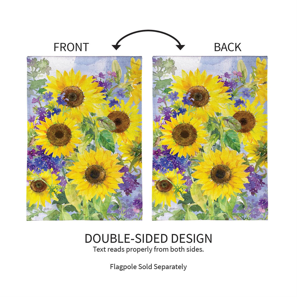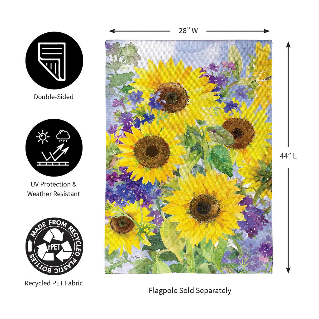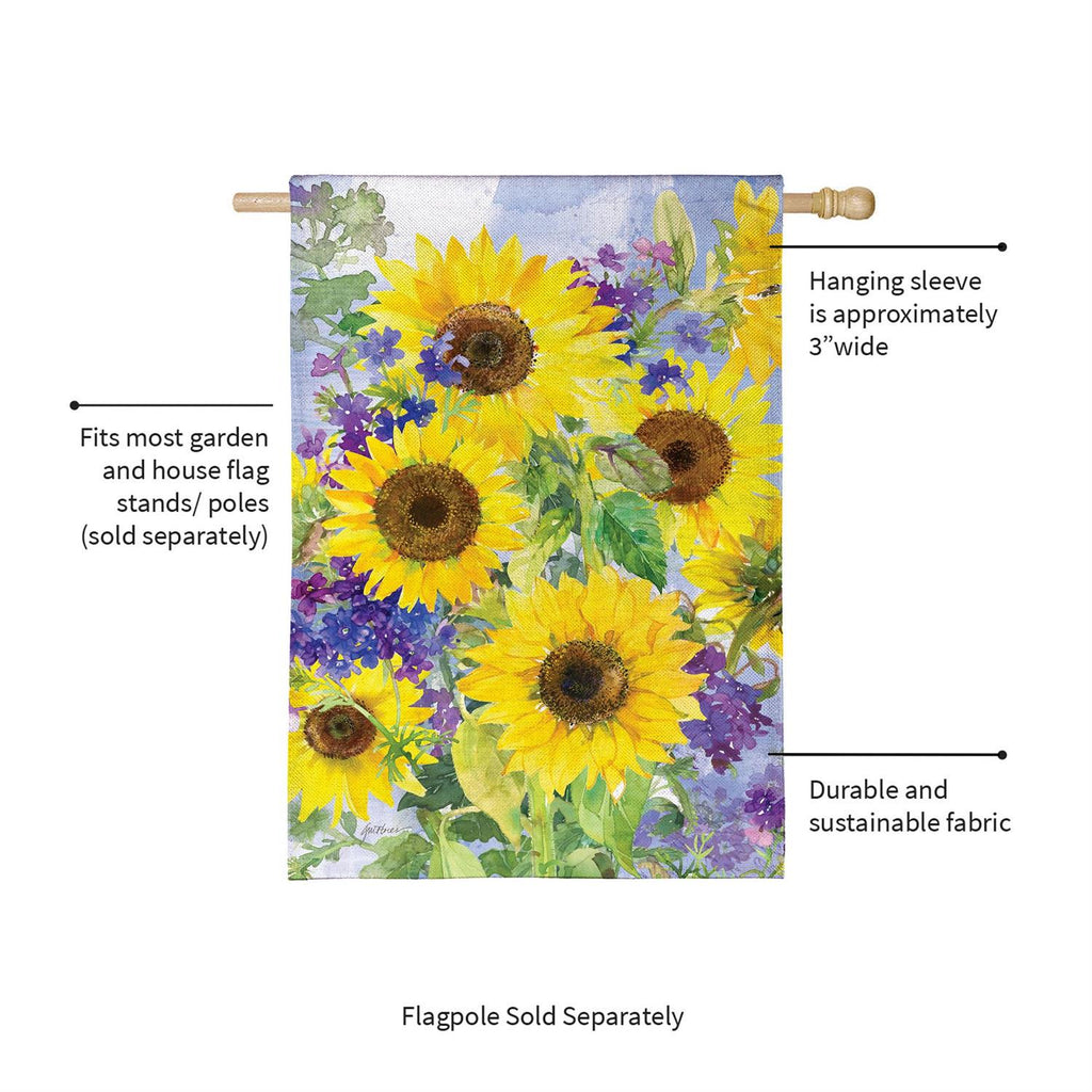 Bring vibrant charm to your outdoor space with the Sunflower Happiness Burlap House Flag. This beautifully designed flag showcases a stunning array of sunflowers and wildflowers, providing a burst of color that enhances any garden setting. Crafted from durable burlap, it withstands the elements while maintaining its vivid appearance. Measuring 44 inches in length and 28 inches in width, this flag is the perfect size to make a cheerful statement. Ideal for spring and summer, it adds a welcoming touch to your home's exterior.
