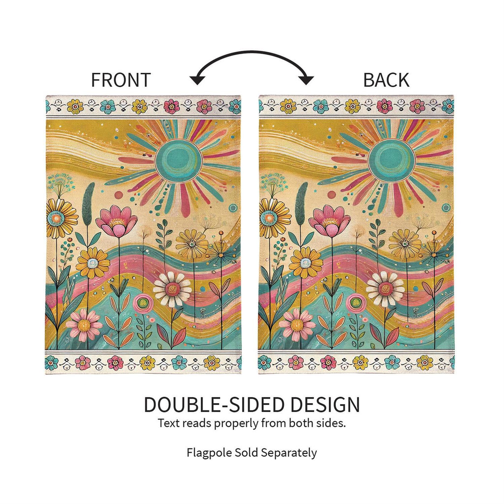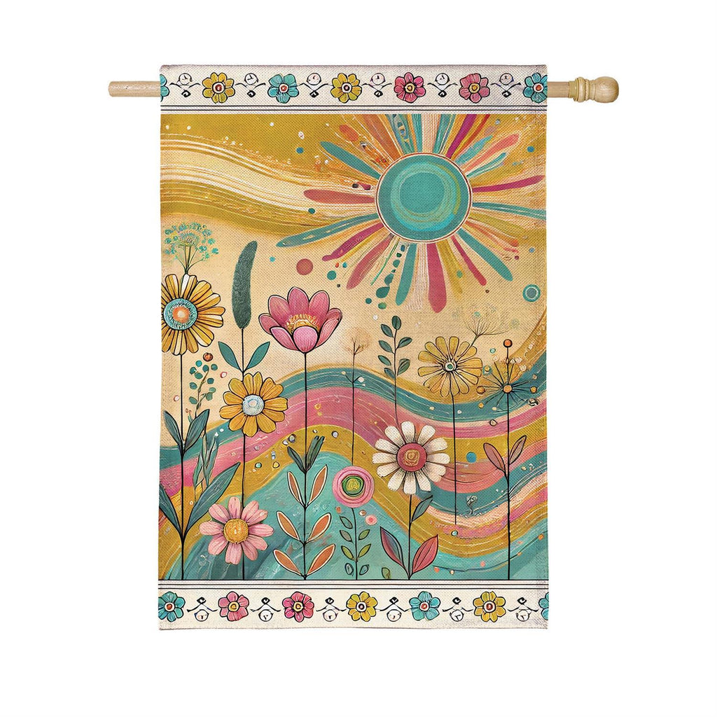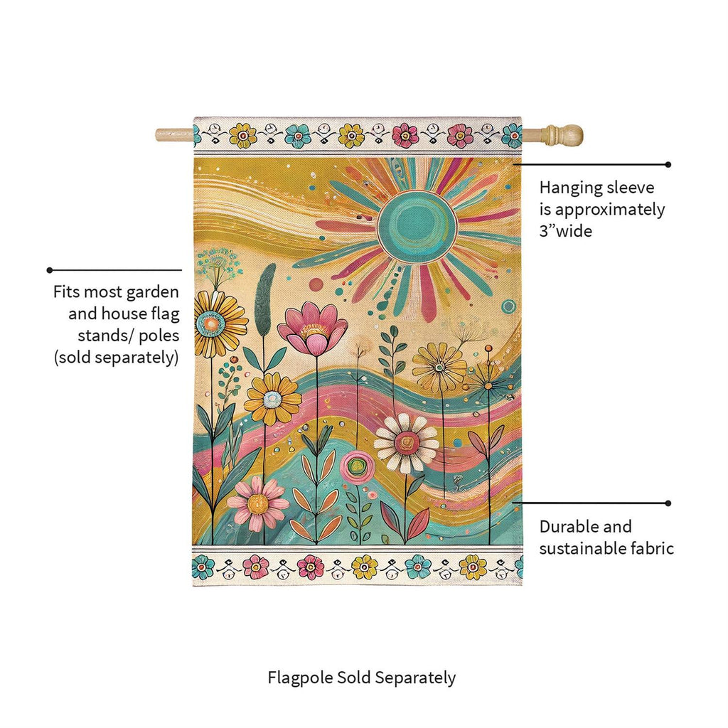 Welcome the warmth and vibrancy of the outdoors with the Sunny Field Burlap House Flag. This beautifully designed flag features a whimsical sun and floral motif, perfect for adding a cheerful touch to your garden or porch. Crafted from durable burlap, this flag is designed to withstand the elements while maintaining its vivid colors. Measuring 44 inches in length and 28 inches in width, it provides a bold statement and a welcoming vibe for any home. Ideal for seasonal decoration or year-round display, this flag will brighten up your outdoor space with its delightful design.