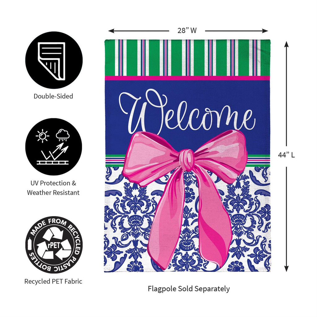 Enhance your home's curb appeal with the Welcome Bow Chinoiserie Burlap House Flag. This elegant flag showcases a vibrant pink bow against a rich blue background, adorned with a classic Chinoiserie pattern. Measuring 44 inches long by 28 inches wide, it’s designed to make a bold statement at your entryway. Crafted from durable burlap, it’s perfect for adding a welcoming touch throughout the seasons. Whether greeting guests or adding a decorative flair to your garden, this flag combines style and durability.
