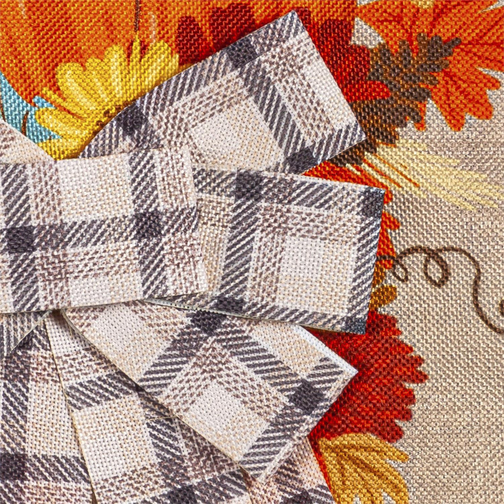 Add a festive touch to your garden with this Pumpkin and Bow Garden Burlap Flag. Made from durable burlap, this flag features a beautifully detailed pumpkin design adorned with a charming plaid bow. Perfect for autumn, this flag will bring warmth and seasonal cheer to your outdoor space. Measuring 18 inches by 12.5 inches, it's the ideal size for displaying on your flagpole or garden stake. Enhance your garden's aesthetic with this vibrant and inviting decoration.
