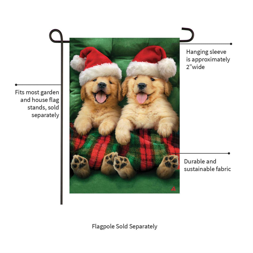 Welcome the festive season with the Cozy Goldies Lustre Garden Flag, perfect for adding a touch of warmth and joy to your outdoor décor. Measuring 12.5 inches in width and 18 inches in height, this flag features an adorable design of two puppies wearing Santa hats, making it ideal for spreading holiday cheer. The flag's vibrant colors and lustrous finish catch the eye, while its durable material ensures it withstands winter weather. Whether placed in your garden or by the front door, this charming flag is a delightful way to celebrate the holidays.