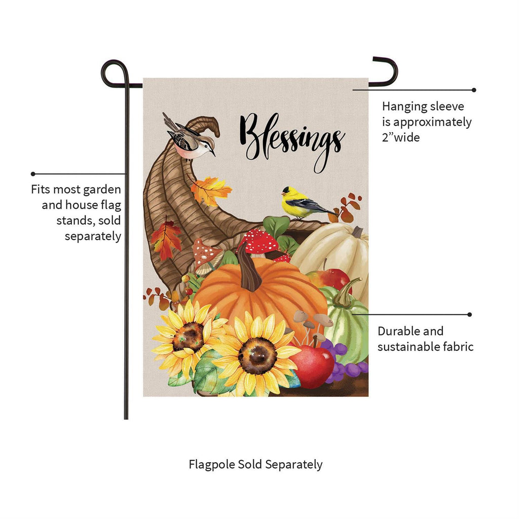 Embrace the spirit of autumn with this Grateful Cornucopia Suede Garden Flag. Perfect for adding a festive touch to your outdoor space, this flag features a vibrant cornucopia design filled with harvest bounty, colorful leaves, and cheerful birds. Made from premium suede fabric, it offers durability and a rich texture that stands out in any garden or yard. With dimensions of 12.5 x 18 inches, it's an ideal size to make a charming seasonal statement. Welcome the season of gratitude with this eye-catching garden flag.