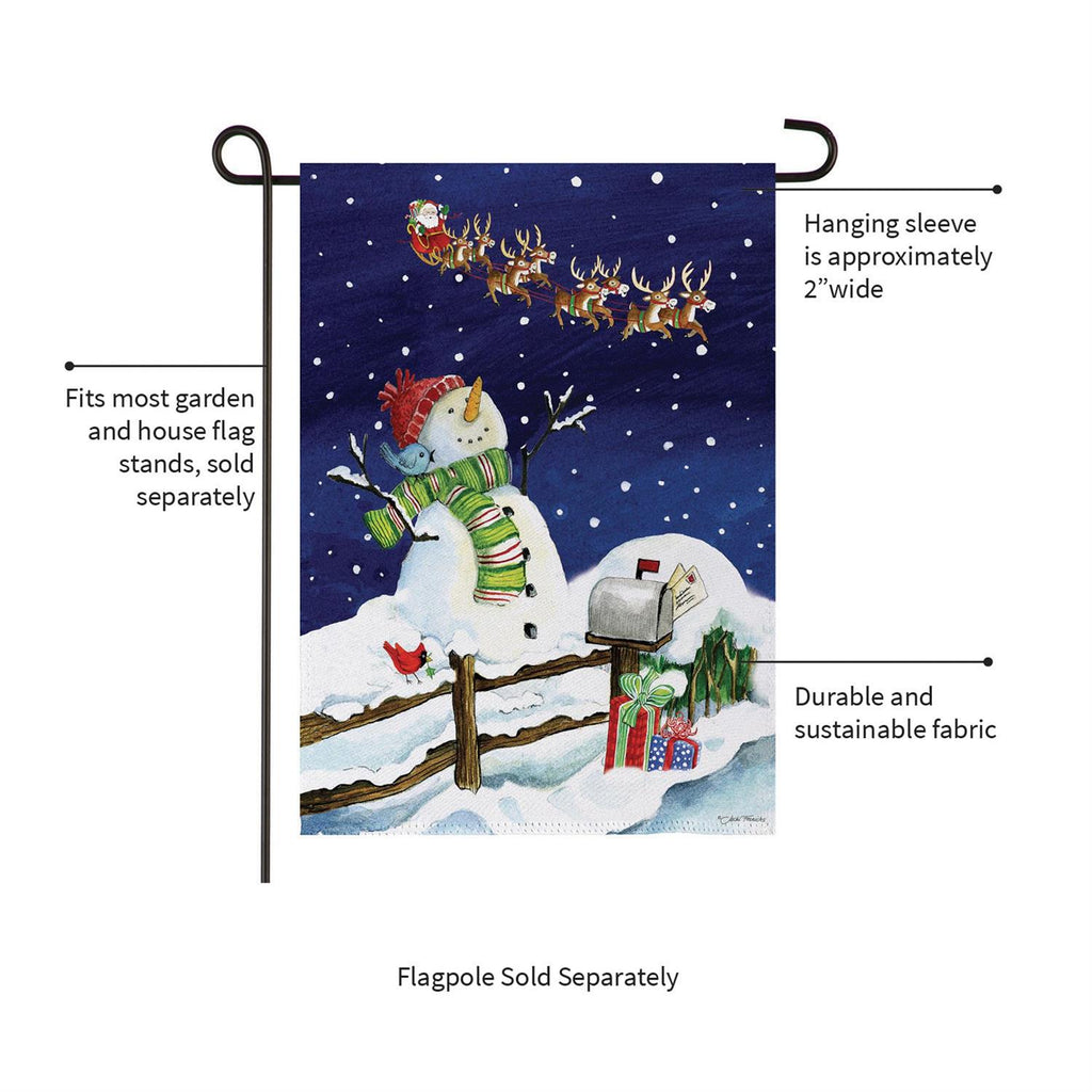 Enhance your holiday décor with this charming Santa & Snowman Suede Garden Flag. Measuring 12.5 x 18 inches, this flag features a delightful winter scene with Santa and his reindeer soaring through a starry night sky above a cheerful snowman. Made from high-quality suede, it offers vibrant colors and a soft texture, perfect for adding festive cheer to your garden or front yard. This durable flag is designed to withstand winter weather, making it a beautiful and practical addition to your seasonal decorations.