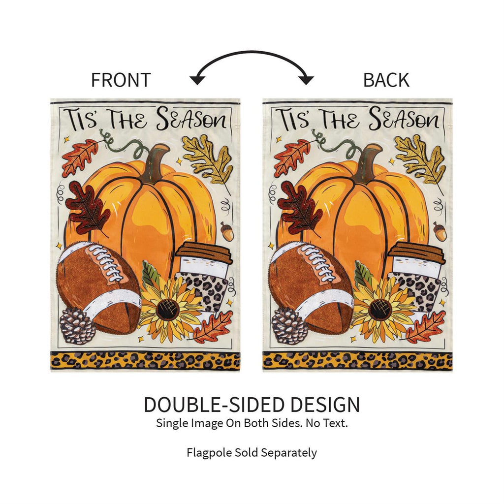 Celebrate the vibrant essence of fall with the 'Tis' The Season Fall Applique Garden Flag. Crafted to elevate your outdoor décor, this flag features a vivid pumpkin design accented with seasonal elements like leaves, a football, and a cozy cup. Measuring 12.5 inches by 18 inches, it perfectly fits standard garden flag poles. The applique technique adds a textured, three-dimensional effect that ensures the design stands out beautifully. Ideal for welcoming guests or adding a festive touch to your garden, this flag is a must-have for the autumn season.