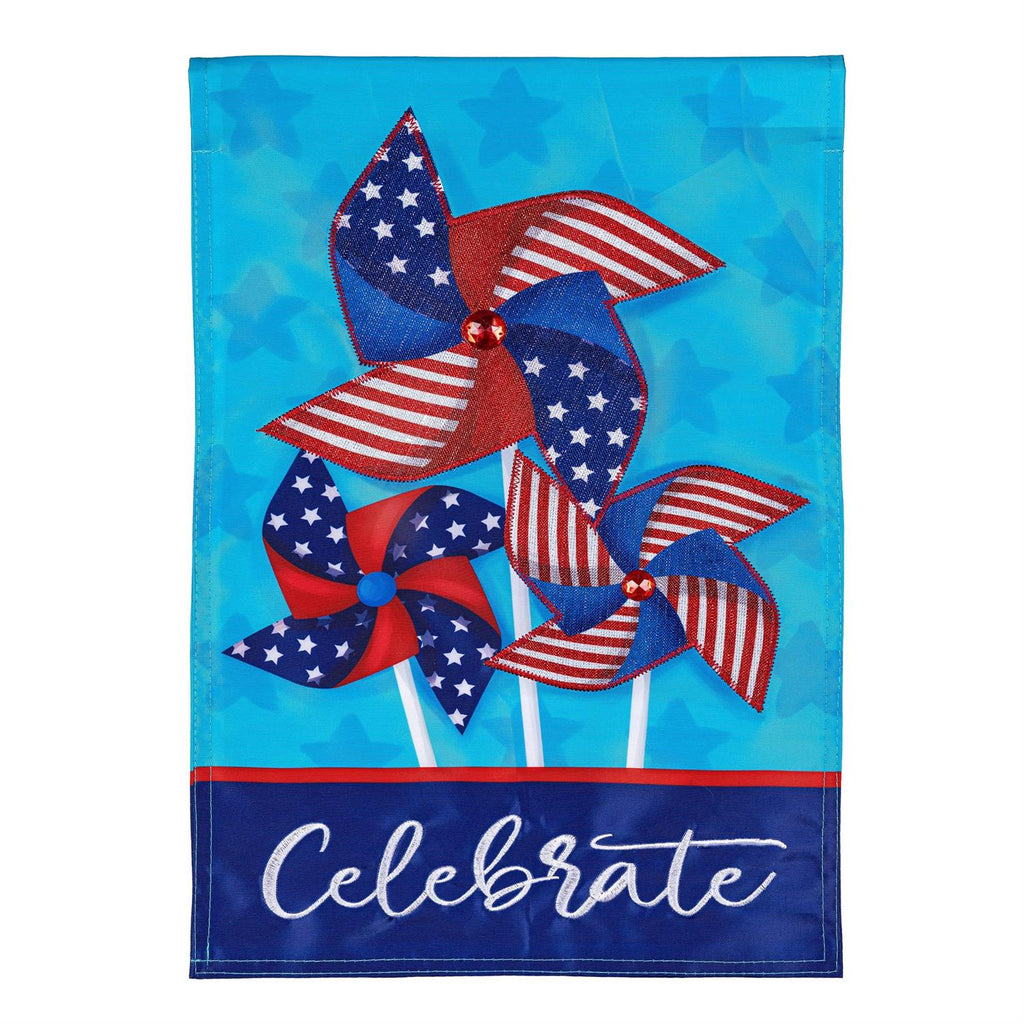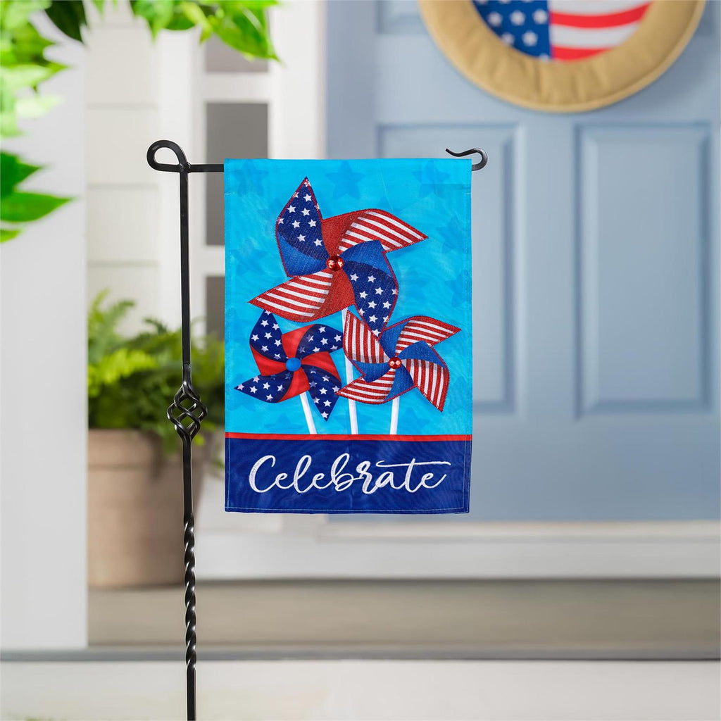 Add a festive touch to your outdoor space with the Celebrate Pinwheel Applique Garden Flag. Measuring 12.5 inches in width and 18 inches in height, this vibrant flag features patriotic pinwheel designs in red, white, and blue, perfect for celebrating national holidays or adding a pop of color to any occasion. The applique construction adds texture and depth, making it a standout piece in your garden or front yard. Crafted for durability, this flag is designed to withstand outdoor conditions while maintaining its bright colors and detailed design. Welcome guests with a cheerful and lively display that embodies the spirit of celebration.