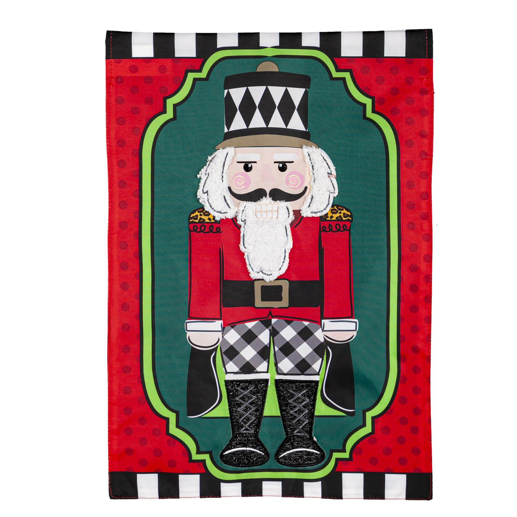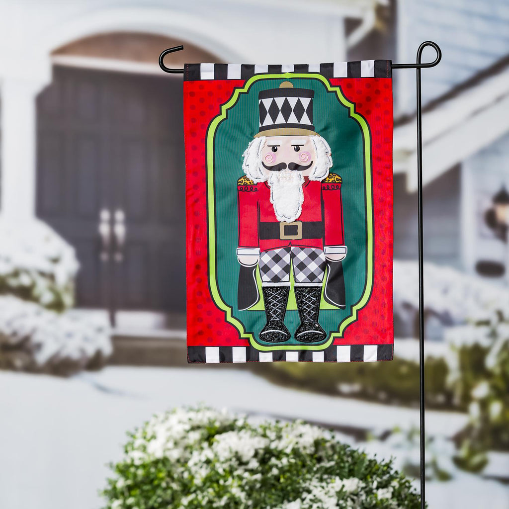 Add a touch of festive charm to your outdoor space with this Patterned Nutcracker Garden Applique Flag. Measuring 12.5 by 18 inches, this vibrant flag features a classic nutcracker design with intricate detailing and rich colors. Perfect for the holiday season, its durable fabric ensures it stands resilient against the elements, maintaining its vibrant appeal. The flag's striking patterns and playful theme make it a delightful addition to your garden or entryway, welcoming guests with holiday cheer.