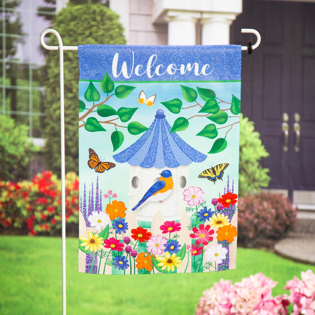 Welcome guests to your garden with this charming Birds and Birdhouse Suede Garden Flag. Featuring a colorful scene of birds, butterflies, and a quaint birdhouse surrounded by vibrant flowers, this flag brings a lively touch to any outdoor space. Made from durable suede, it withstands the elements while maintaining its bright colors. Ideal for spring and summer, this flag adds a cheerful note to your garden, porch, or patio.