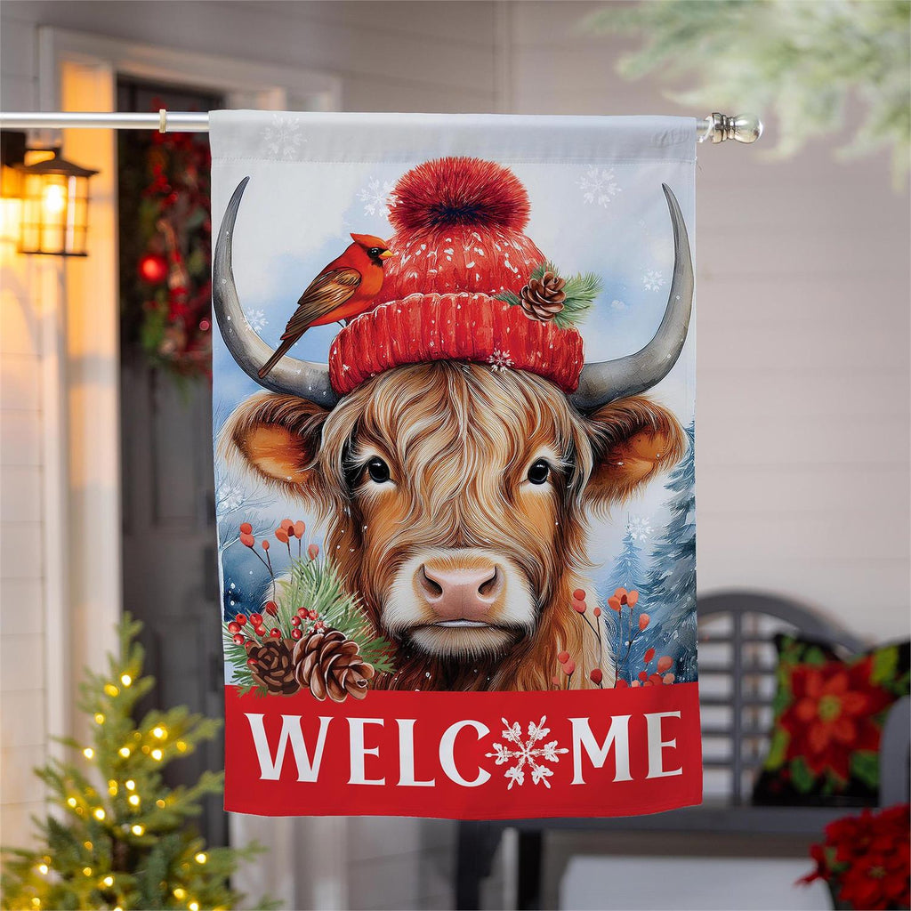 Welcome the winter season with charm and warmth using the Bundled Up Highland Cow Suede House Flag. This delightful flag showcases a cozy highland cow adorned with a festive red hat, accompanied by seasonal elements like pinecones and a cardinal. Made from durable suede, this flag offers vibrant colors and a soft texture, making it a perfect addition to your outdoor décor. Measuring 29 x 43 inches, it's ideal for creating a welcoming atmosphere at your front porch or garden. Elevate your home's curb appeal with this whimsical and inviting design.